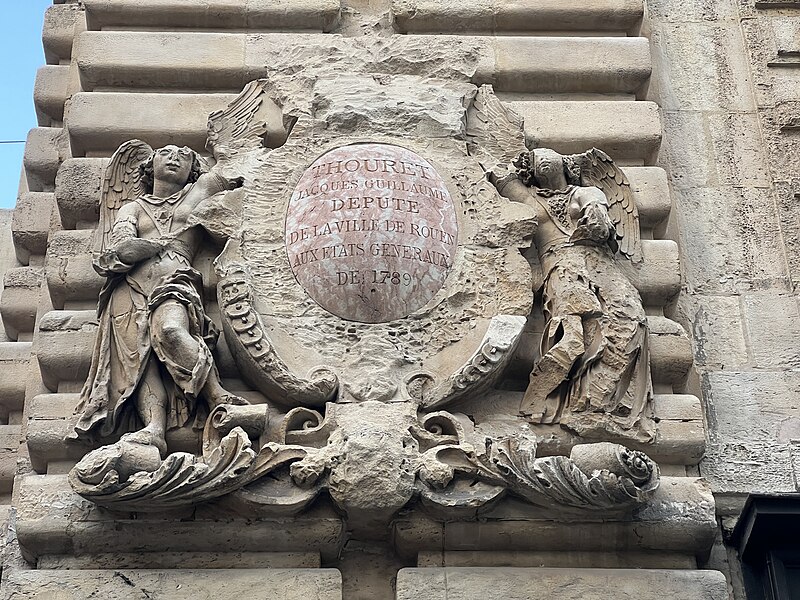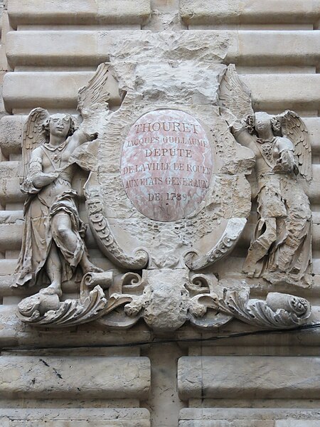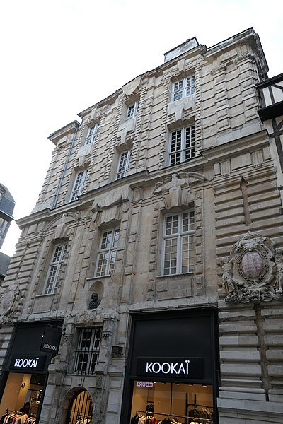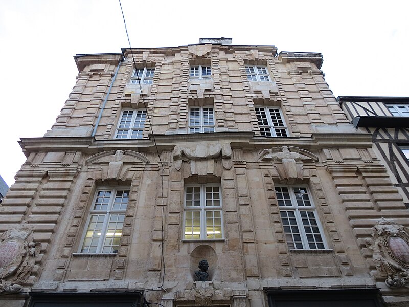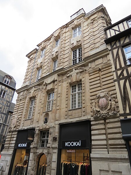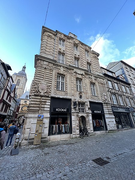 L’hôtel de ville de Rouen occupe depuis 1800 l’ancien dortoir de l’abbaye Saint-Ouen, désaffectée en novembre 1790, et aménagé pour accueillir l’administration municipale. Avant cette installation, la mairie siégeait en divers lieux de la ville, ses transferts répondant à l’accroissement des besoins administratifs. Dès l’origine communale on suppose que l’autorité municipale s’établit dans la Halle aux Marchands, attestée à partir de 1191-1192 au sud‑ouest de l’église Saint‑Éloi. À partir de 1220, l’hôtel de ville s’installe près de la rue du Gros‑Horloge, sur un fief de la famille de Leicester, et un beffroi y est édifié entre 1220 et 1251, témoin de la puissance communale ; il abritait notamment deux cloches, la Cache‑Ribaud (1 900 kg) et la Rouvel (1 200 kg). En 1352, la commune acquiert des terrains au nord de la rue du Gros‑Horloge, liés à la famille Du Chastel, et c’est à cet emplacement que sera plus tard construit le bâtiment de Jacques Gabriel ; jusqu’à la Révolution, l’hôtel de ville repose dans le manoir des Du Chastel. Après la révolte de la Harelle de 1382, le beffroi est rasé et l’année suivante la ville entreprend la construction d’une horloge ; une tour est édifiée entre 1389 et 1398 par Jehan de Bayeux pour abriter le mécanisme, les cadrans étant installés dès 1410 puis intégrés, après démolition de la porte Massacre, dans un pavillon achevé en 1529. Jugé trop petit et menaçant ruine en 1606, l’édifice gothique est reconstruit à partir de juin 1607 par Jacques I Gabriel dans un style florentin en pierre à bossage, avec un rez‑de‑chaussée formé d’arcades occupées par des boutiques ; il est étendu en 1738 et, malgré ces aménagements, redevient insuffisant au XVIIIe siècle. Vendu en 1796, l’ancien hôtel de ville voit ses façades inscrites au titre des monuments historiques le 15 avril 1966 et la façade sur la rue du Gros‑Horloge faire l’objet d’une restauration en 1982. Pour résoudre le problème de place, un projet signé Antoine Mathieu Le Carpentier est lancé à l’ouest de la ville, devant la place du Vieux‑Marché ; les travaux, commencés en 1758, sont interrompus en 1765 et seules des fondations subsistent rue Thomas‑Corneille ; la maquette en chêne réalisée par Drouin en 1758 est exposée au musée des beaux‑arts. L’hôtel de la Première Présidence, construit de 1717 à 1721 par l’architecte Martinet, abrite les bureaux de la mairie de janvier 1791 à mai 1800 ; il est détruit le 25 août 1944, et il subsiste aujourd’hui le portail rue Saint‑Lô qui donne accès à la terrasse de l’espace du Palais. Installé dans l’ancienne abbaye Saint‑Ouen le 30 mai 1800, l’hôtel de ville est ensuite transformé en 1825 par l’architecte départemental Charles‑Félix Maillet du Boullay pour mieux remplir sa fonction : l’édifice se compose de deux étages, de deux ailes et d’un péristyle central formant au rez‑de‑chaussée le vestibule d’honneur, surmonté d’une loge à colonnade et couronné d’un fronton où est apposée une horloge, la façade côté jardin restant inchangée. Pendant plusieurs années, le deuxième étage a abrité le muséum et la bibliothèque avant leur transfert ultérieur. L’édifice est partiellement incendié dans la nuit du 30 au 31 décembre 1926, entraînant la perte des archives de 1800 à 1926 ; la salle des mariages et la salle du conseil municipal sont épargnées et de nombreux tableaux et statues, dont celle de Louis XV, sont sauvés ; l’architecte Edmond Lair procède à la reconstruction en 1928. Durant la Seconde Guerre mondiale, la Feldkommandantur 517 occupe l’hôtel et les bombardements endommagent le bâtiment : l’escalier sud est détruit par une bombe le 19 avril 1944, mais les Rouennais hisseront le drapeau tricolore au fronton le jour de la Libération. Face aux besoins de la ville, le conseil municipal décide le 3 octobre 1960 des travaux fondés sur un projet de l’architecte d’intérieur Maxime Old, qui assure la maîtrise d’œuvre et fait appel à Jean‑Pierre Demarchi pour les médaillons de la salle du conseil et à Raoul Ubac pour les tapisseries de la galerie. La façade sur le jardin et la couverture bénéficient d’une inscription au titre des monuments historiques depuis le 18 février 1948. La façade et l’intérieur de l’hôtel de ville apparaissent dans le film Adieu poulet de Pierre Granier‑Deferre (1975). Parmi les éléments visibles ou conservés figurent l’ancien hôtel de ville rue du Gros‑Horloge, la maquette de Le Carpentier réalisée par Drouin exposée au musée des Beaux‑Arts, le portail de l’hôtel de la Première Présidence, la proximité entre l’hôtel de ville et l’abbatiale Saint‑Ouen, la salle du conseil conçue par Maxime Old, la vue depuis les jardins, la plaque commémorative de la reconstruction, les statues de Corneille et de Jeanne d’Arc au bas du grand escalier, la statue intitulée Louis XV le Bien‑Aimé sur le premier palier et une plaque commémorative en marbre en hommage au concert de Frédéric Chopin à Rouen, inaugurée le 20 septembre 2024.