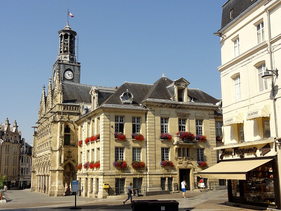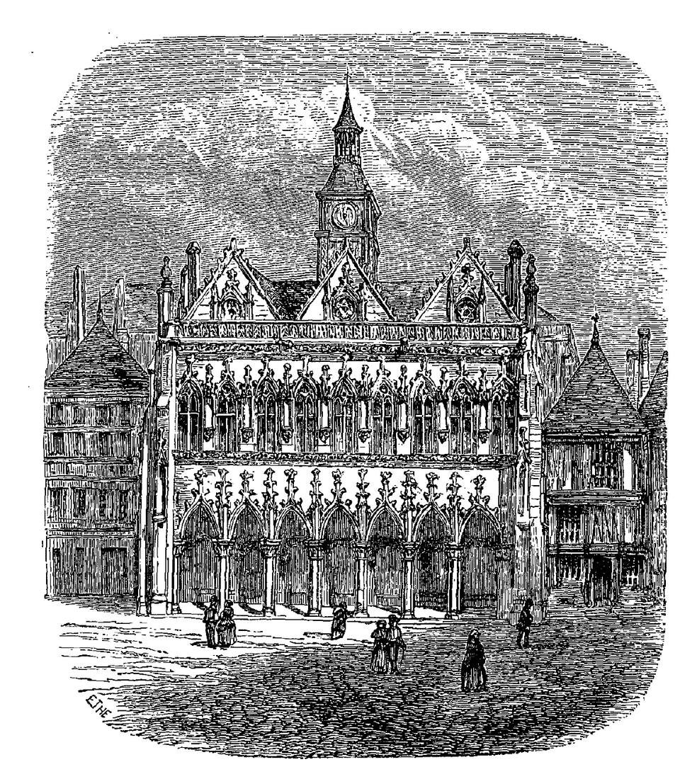 À l'intérieur, l'ancienne salle du conseil municipal, transformée en salle des mariages lors des travaux de réaménagement, conserve une grande cheminée dont le manteau est gothique et le couronnement de style Renaissance. La salle présente un plafond en carène de navire constitué d'une double voûte en bois reposant sur une poutre transversale, la voûte étant doublée de bardeaux peints d'étoiles ; la poutre s'appuie sur deux pierres sculptées représentant le jugement de Pâris et un écusson armorié, et la salle comporte six têtes en bois peint que l'historien Charles Gomart identifie comme le mayeur d'enseigne, le geôlier, le mayeur, l'argentier, l'architecte et le fou. Des peintures de Gabriel Girodon décorent la pièce et une porte à deux vantaux de style Louis XIV, offerte en 1719 par le négociant Etienne Fizeaux, ouvre sur l'ancienne chapelle aménagée aujourd'hui en salle d'attente des mariages.