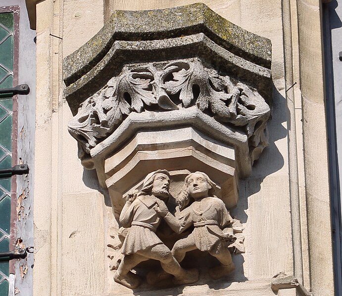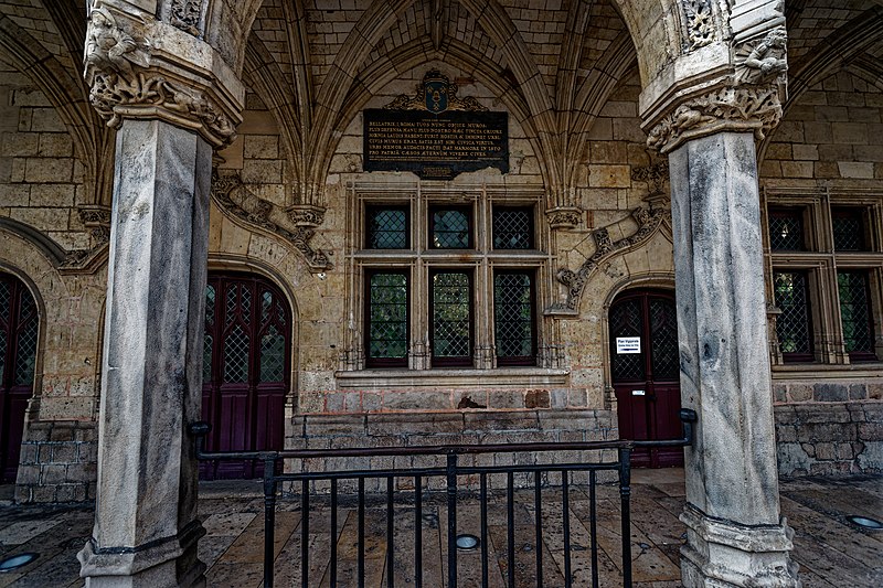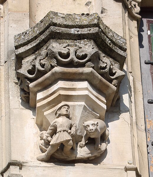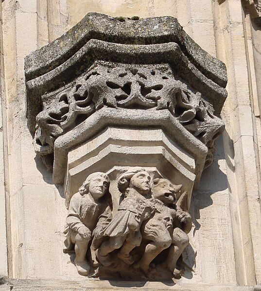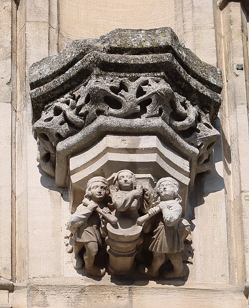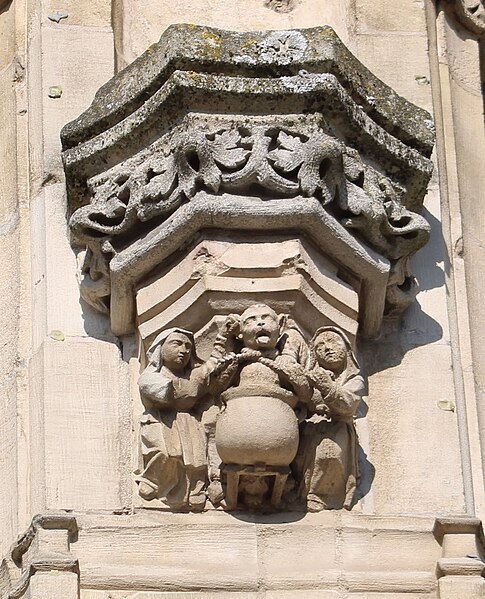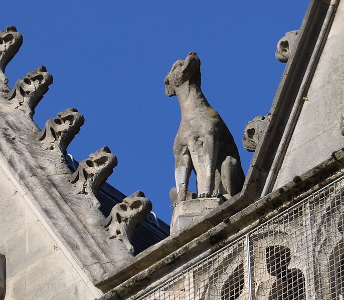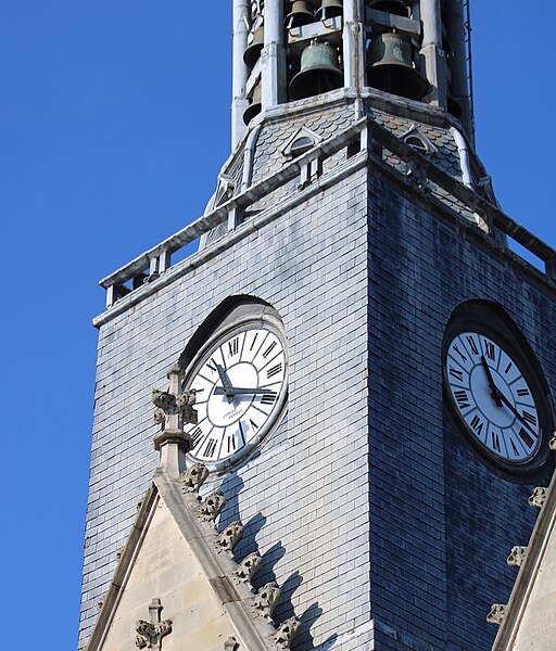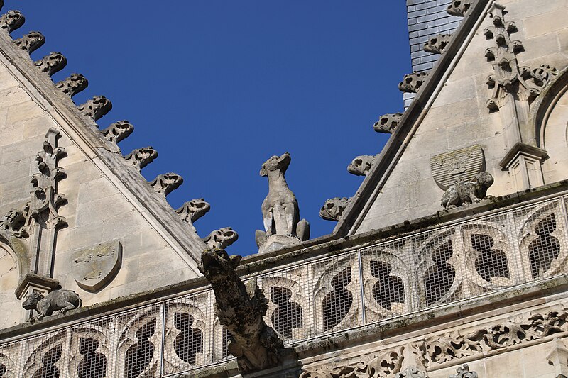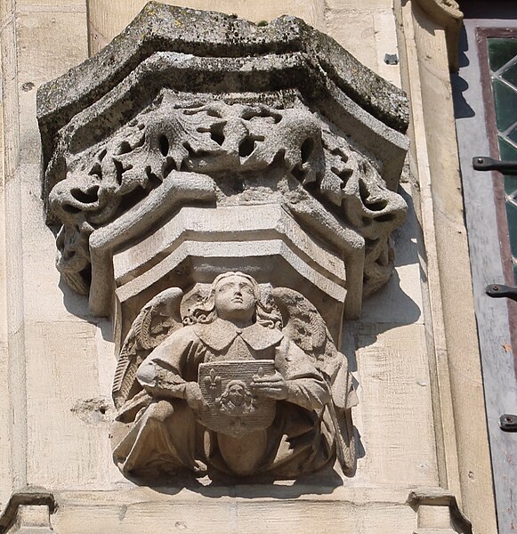 La façade principale s'élève sur trois niveaux ; au rez-de-chaussée un portique précède l'entrée, le premier étage comprend une galerie éclairée par neuf fenêtres à meneau et surmontée d'une balustrade ajoutée au début du XXe siècle, tandis que le troisième étage est formé de trois pignons triangulaires ornés chacun d'un oculus. Des écussons figurant les armes des familles de Moÿ, de La Fons, de la ville de Saint-Quentin, du Vermandois, de la famille d'Y et de la famille Dorigny encadrent la composition, qui est parée d'un décor végétal de feuilles de chêne, de vigne et de chou frisé. En 1759 fut dressé un campanile octogonal qui abrite un carillon de trente-sept cloches datant de 1924.
