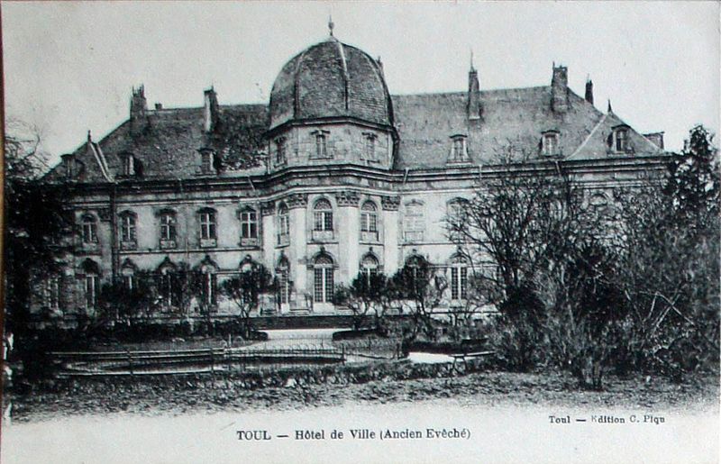 L’hôtel de ville de Toul, ancien palais épiscopal situé rue de Rigny, a été édifié pour l’évêque Scipion-Jérôme Bégon dans la première moitié du XVIIIe siècle ; il abrite aujourd’hui la mairie. Le bâtiment suit le plan classique d’un palais entre cour et jardin, rythmé par un ordre colossal de pilastres. Le porche s’ouvre sur un portail arrondi d’ordre ionique, surmonté d’un fronton cintré et agrémenté de balustres d’inspiration toscane, et donne accès à une cour intérieure rectangulaire à fond semi-elliptique. La façade du corps principal, de grandes dimensions, est encadrée par deux ailes qui ferment la cour : l’aile gauche accueillait jadis cuisines et boulangerie, l’aile droite des chambres dont l’officialité. À l’arrière, une avancée polygonale coiffée d’un dôme à pans, inspirée de la façade du château de Vaux-le-Vicomte, forme une demi-rotonde qui, aujourd’hui salle des mariages, fut autrefois l’auditorium de l’évêque. La toiture est en ardoise, son faîtage en plomb, et la couverture est percée de douze lucarnes en pierre sculptée. Jusqu’à sa destruction par des incendies survenus les 21 décembre 1939 et 22 juin 1940, l’intérieur était richement décoré, avec boiseries, pièces sculptées et un mobilier important comptant au moins vingt-cinq cheminées. Après ces sinistres, l’édifice a été restauré entre 1972 et 1977 ; sa réhabilitation ultérieure a donné aux espaces intérieurs un aménagement de style contemporain. À la tête d’un vaste diocèse regroupant au XVIIIe siècle quelque 800 paroisses et 200 annexes, les évêques de Toul, responsables spirituels d’une population importante, souhaitaient une résidence représentative de leur rang. Mgr Scipion-Jérôme Bégon fit appel, vers 1735, au frère architecte Nicolas Pierson, prémontré de Rangéval, et au maître d’œuvre Dominique Charpy, entrepreneur adjudicataire de l’évêché ; Charpy, oncle par alliance de Richard Mique, acheva le corps principal en 1743, tandis que les ailes furent terminées après 1754 sous l’épiscopat de Mgr Claude Drouas de Boussey. Lors de la visite du duc de Lorraine Stanislas Leszczynski en 1737 furent édifiées les écuries et les remises, et la première pierre du corps principal fut posée en 1739. Confisqué en 1791 à Mgr Étienne François Xavier des Michels de Champorcin, le palais fut acquis par la ville de Toul avec le concours du sous-préfet Joseph Carez ; il y fut installé l’hôtel de ville, la sous-préfecture et le tribunal, et le 26 janvier 1794 les signes extérieurs de superstition et les armoiries furent effacés. Endommagé en 1870 lors de la guerre franco-prussienne, le bâtiment accueillit en 1872 une partie du musée municipal. L’ancien palais et son jardin ont été classés au titre des monuments historiques en 1930. Après les incendies de 1939 et 1940 qui détruisirent la décoration intérieure et entraînèrent le transfert des services municipaux, l’édifice resta trente-trois ans à l’abandon avant sa restauration puis sa réhabilitation comme hôtel de ville. Les propriétaires successifs sont Mgr Scipion-Jérôme Bégon (commanditaire, 1739-1753), Mgr Claude Drouas de Boussey (1754-1773), Mgr Étienne François Xavier des Michels de Champorcin (1773-1791) et la Ville de Toul depuis 1791.