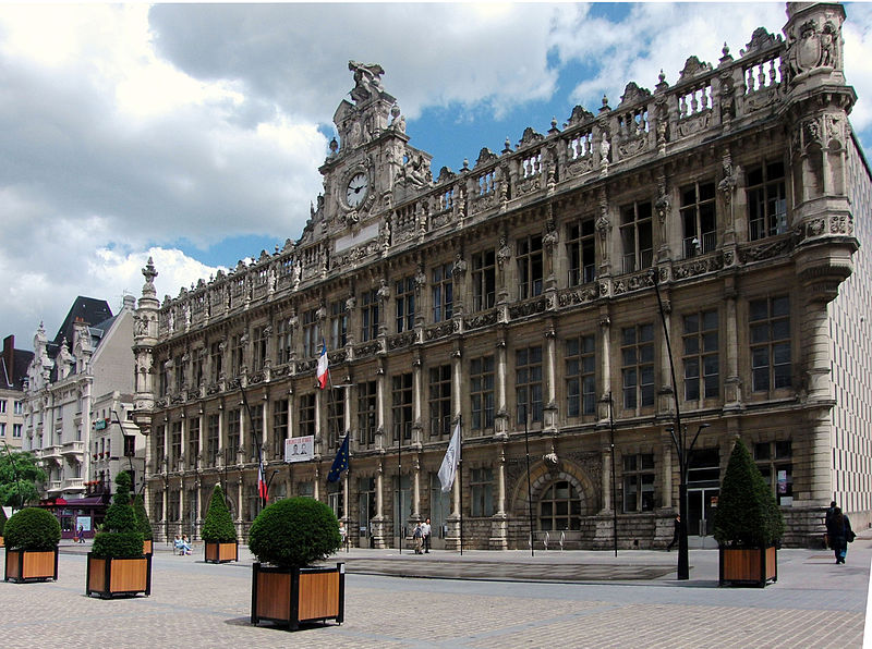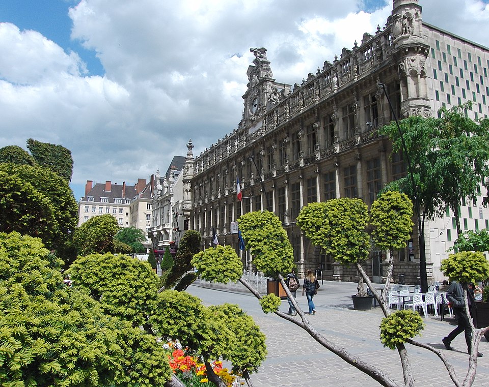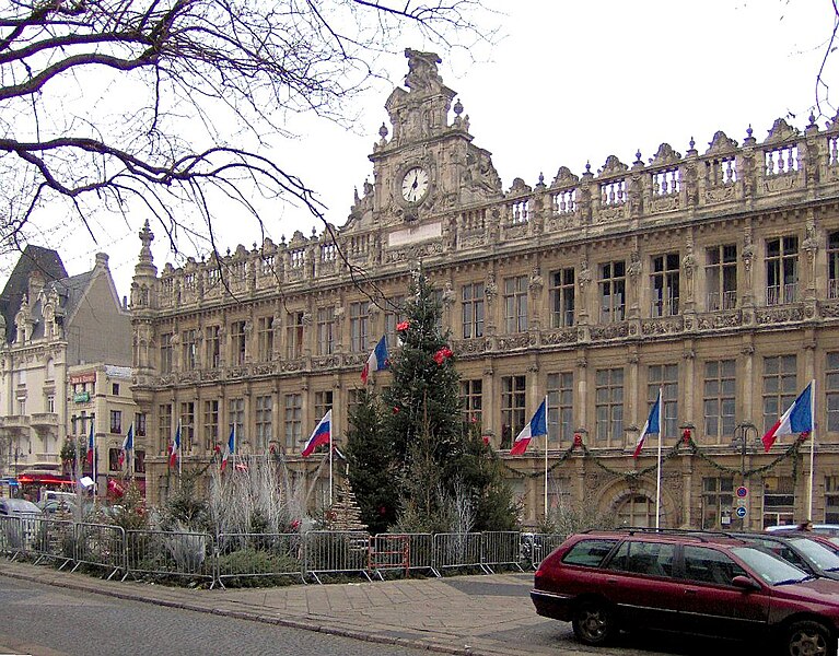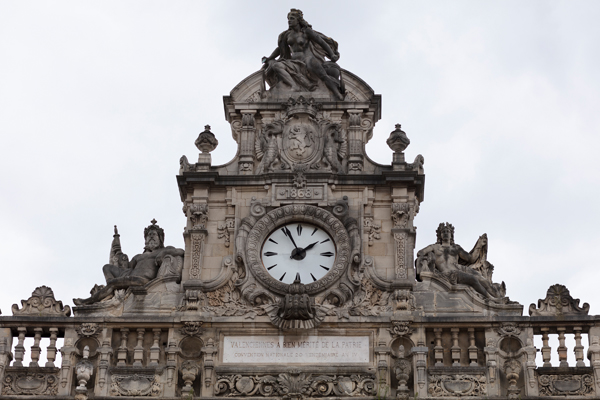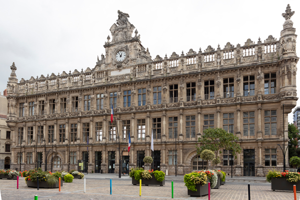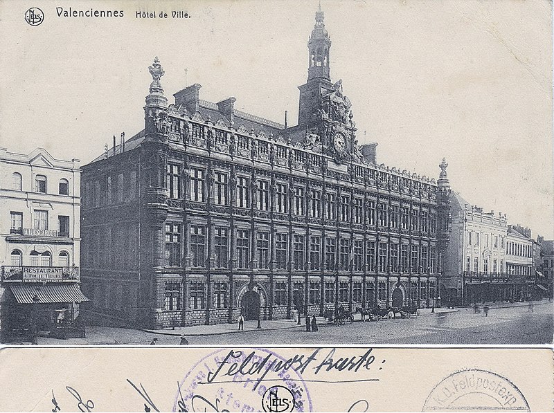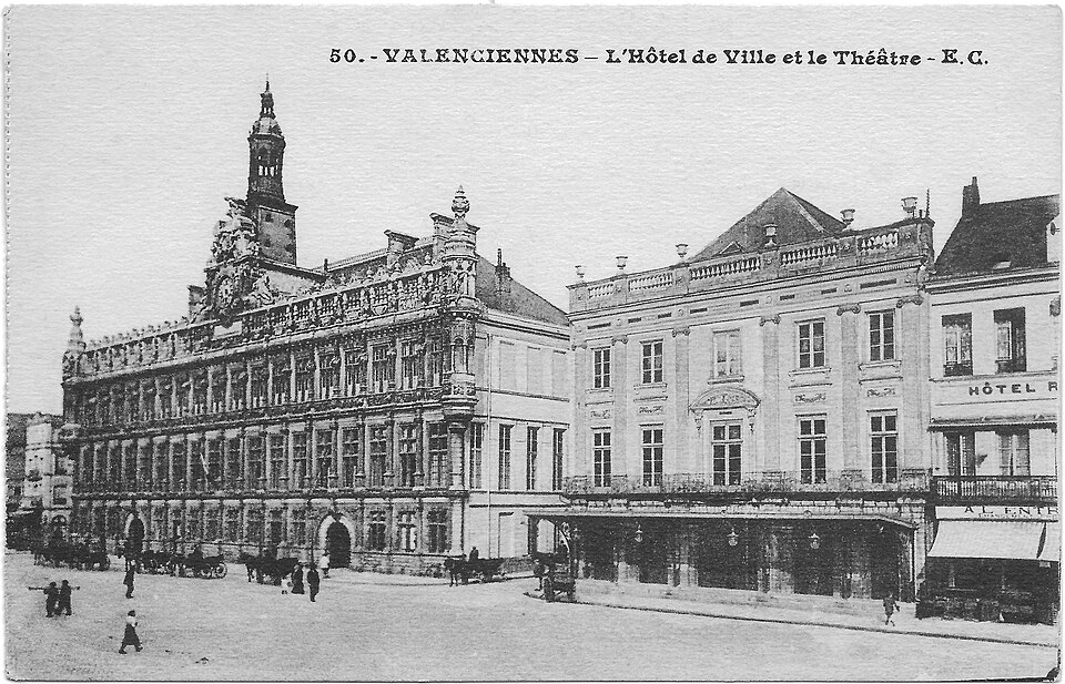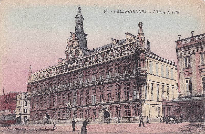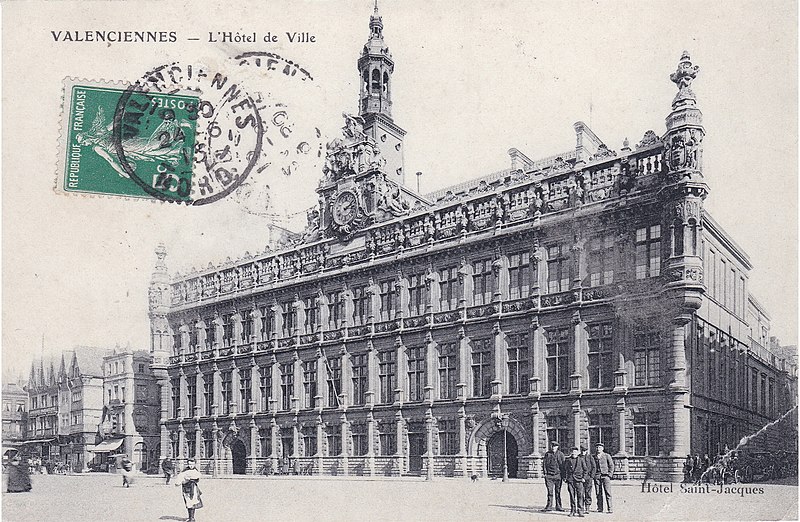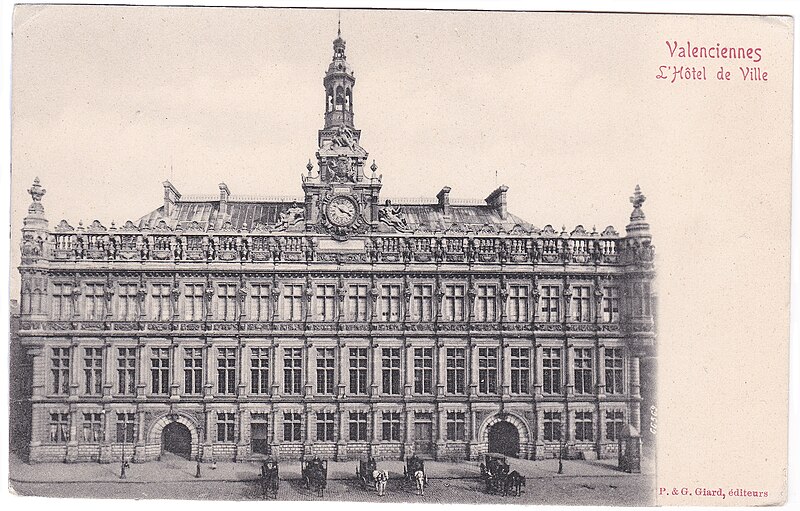 L'hôtel de ville de Valenciennes, situé place d'Armes et inscrit aux monuments historiques, abrite les institutions municipales depuis le Moyen Âge. Sa façade du XVIIe siècle est rattachée à un corps de bâtiment reconstruit dans les années 1950, l'original ayant brûlé pendant la Seconde Guerre mondiale. En 1611, le prévôt Jean Roisin ordonna la reconstruction de la maison échevinale ; les travaux durèrent trois ans et absorbèrent un cinquième du budget municipal, remplaçant l'édifice précédent par une bâtisse de style gothique propre aux Pays-Bas espagnols et au Nord de la France. Pendant la Révolution, l'hôtel de ville échappa à des destructions majeures, tandis que la chapelle Saint-Pierre fut désacralisée, transformée en marché aux grains puis démolie en 1828. Au XIXe siècle, l'architecte valenciennois Batigny restaura la façade originelle, y ajouta deux tourelles à chaque extrémité et confia un programme de statuaire à Carpeaux, enfant du pays ; celui-ci réclama un ensemble plus vaste que celui finalement retenu, limité au grand fronton personnifiant la ville et à quelques statues féminines entre les fenêtres. Les bombardements de 1940 dévastèrent une grande partie du centre et ne laissèrent de l'hôtel de ville que sa façade ; le beffroi s'effondra, entraînant la chute de l'horloge et de la sculpture « Valenciennes défendant ses remparts ». Le plan de reconstruction initial, confié à Albert Laprade, proposait une nouvelle perspective sur la place et l'introduction d'un axe visuel ; un changement d'architecte en chef fit évoluer le projet, Jean Vergnaud adoptant d'autres axes et renonçant au parti régionaliste de Laprade. Le programme ministériel pour la reconstruction des hôtels de ville exigeait des réponses fonctionnelles précises — accueil du public, bureaux administratifs, pièces officielles et salle du conseil — auxquelles Vergnaud répondit par un projet résolument moderne. Il conserva et consolida la façade, y adjoignit un volume restituant le gabarit ancien, multiplia par trois la parcelle d'implantation et prévît un grand hall public, des salles de réception à l'étage et une tour abritant des bureaux et symbolisant le beffroi. Les travaux débutèrent en 1953. La façade restaurée est devenue un élément du décor urbain et contraste volontairement avec les façades latérales et arrière, composées de blocs de pierre disposés en quinconce et formant un jeu de damier. Voir aussi la liste des monuments historiques de Valenciennes et les portails consacrés aux monuments historiques français et au Nord-Pas-de-Calais.