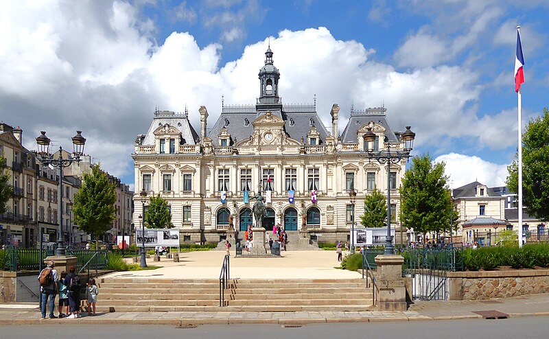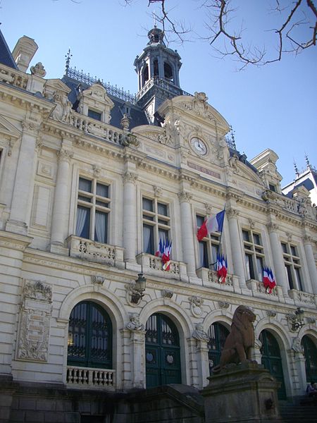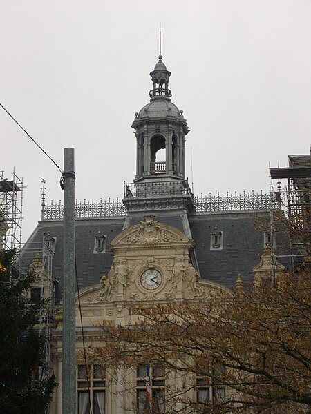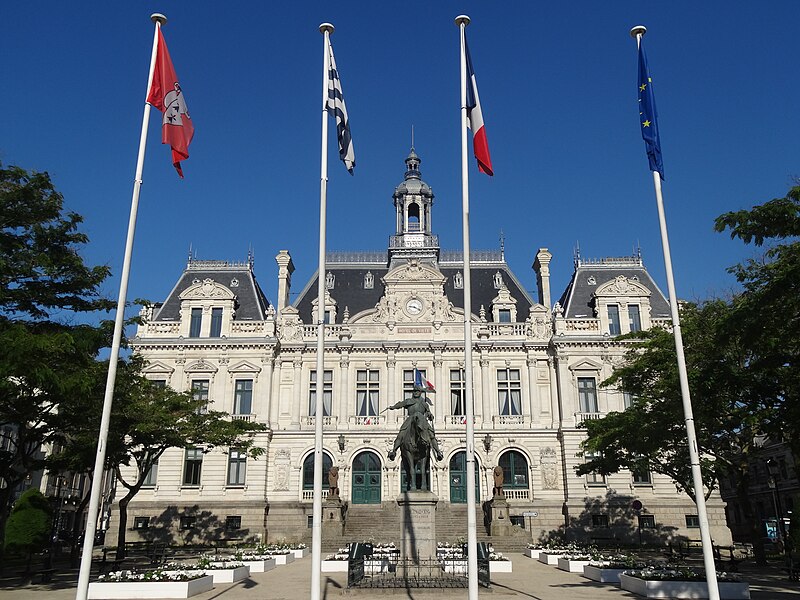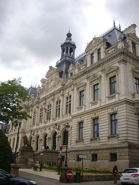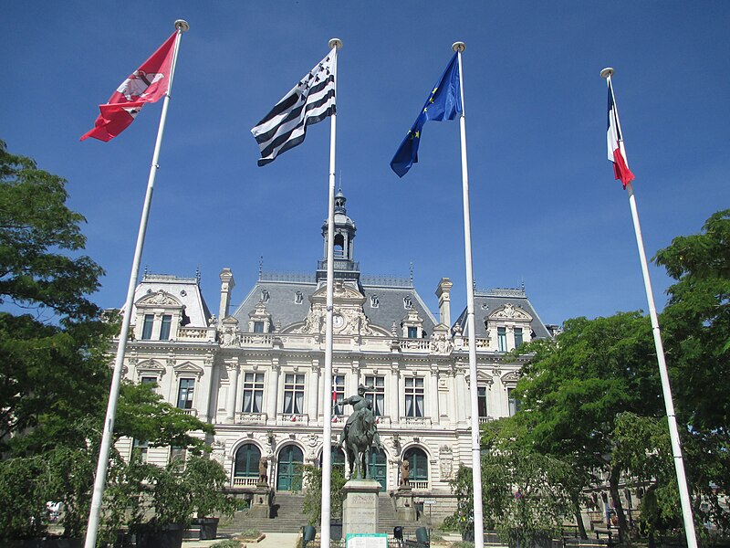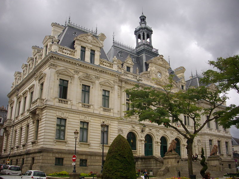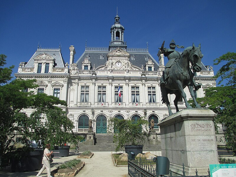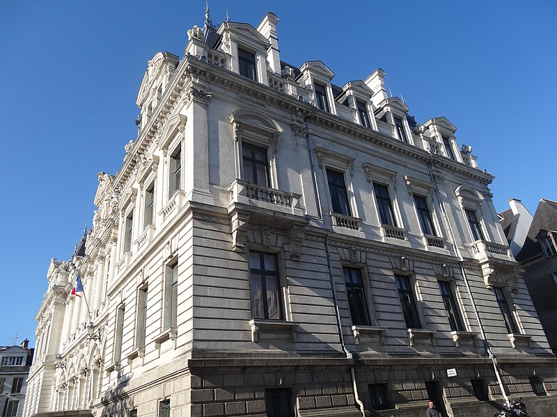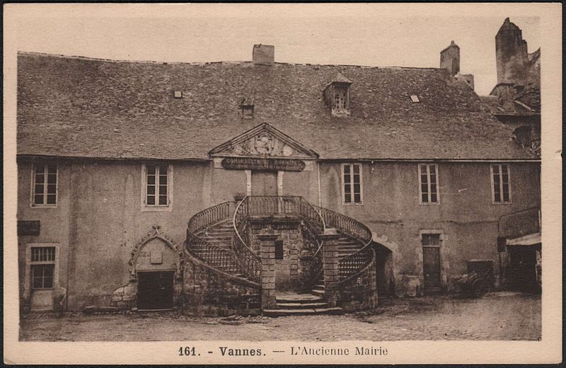 L'hôtel de ville de Vannes accueille une partie des services municipaux et se situe sur la place Maurice Marchais, anciennement place Napoléon et place du Marché. L'autre partie des services est installée au centre administratif municipal, rue Joseph Le Brix. Construit entre 1880 et 1886 pour remplacer une ancienne mairie en mauvais état, il illustre l'architecture des bâtiments publics édifiés sous la IIIe République. Le projet, dont les premiers fondements furent posés par le maire républicain Émile Burgault dès 1847 et mentionné dans des délibérations de 1861, fut relancé en 1878 lorsque le Conseil municipal fixa l'emplacement sur la place actuelle. La première pierre fut posée le 12 décembre 1880 et l'édifice inauguré le 11 juillet 1886 en présence du ministre des Postes Félix Granet, du maire Émile Burgault et du sous‑secrétaire d'État Jean Bernard. Estimé à 410 937,90 francs en juin 1880, le coût final atteignit 793 628 francs, un montant élevé qui fut invoqué lors des municipales de 1888. L'hôtel de ville est inscrit au titre des monuments historiques depuis le 2 décembre 1992. Les plans furent signés par l'architecte vannetais Charier ; le bâtiment, de style Renaissance italienne, est une adaptation à l'échelle de Vannes de l'Hôtel de Ville de Paris. La façade principale, encadrée par deux pavillons, se distingue par un frontispice muni d'une horloge et surmonté du blason de la ville, ainsi que par un grand campanile à carillon rappelant l'ancien beffroi. L'ornementation comporte de grands pilastres aux pavillons, des colonnes engagées à chapiteaux corinthiens, des frontons triangulaires et cintrés alternés, des cartouches, des bustes, des supports de frontispice et des volutes. De nombreux artistes parisiens et nantais ont contribué à un décor intérieur très soigné, parfaitement sauvegardé dans son ensemble. L'ancienne mairie, située sur la place des Lices et de style breton, fut partiellement préservée : son escalier fut installé dans les années 1960 dans la cour de l'Hôtel de Limur. Une campagne de restauration lancée en juin 2010 a concerné le clocheton, la toiture du corps central et des ailes, les éléments décoratifs en zinc et les cheminées ; cette intervention, estimée à trois millions d'euros sur une durée initiale de quatre ans, visait à remédier à la dégradation progressive de l'édifice.