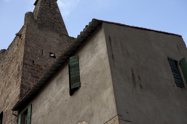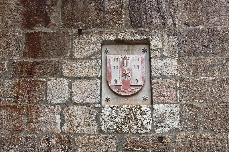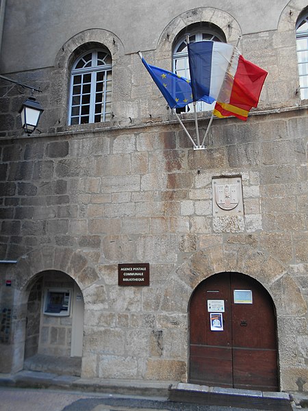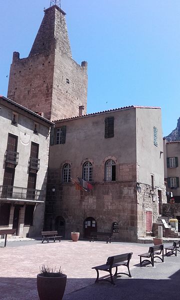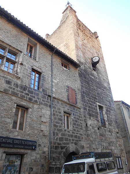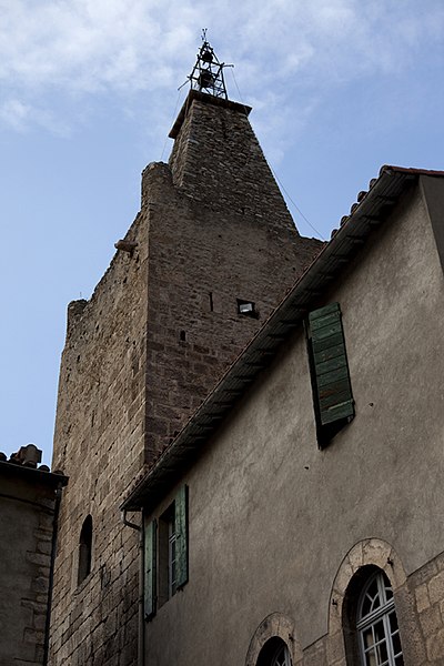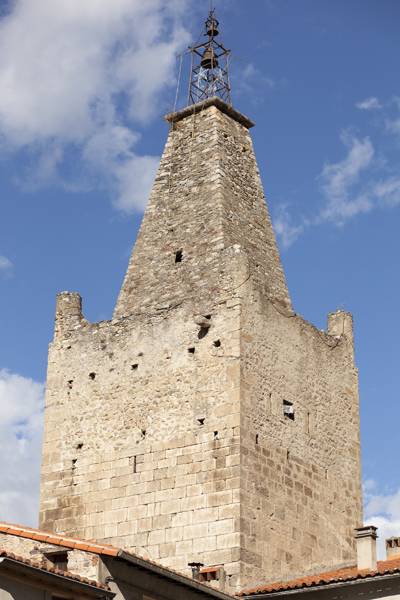 La tour-beffroi, de plan carré, semble remonter, du moins pour son étage de base, aux premières années de la fondation de la ville (XIe siècle). Elle est bâtie en grand appareil aux assises irrégulières et sa porte d'entrée est encadrée de trois énormes blocs monolithiques. L'intérieur, voûté en berceau, a été aménagé en lavoir public. La partie supérieure a reçu, à une époque récente, une lourde flèche en tronc de pyramide à quatre faces, coiffée d'un petit clocheton en fer forgé abritant deux cloches superposées. La maison communale adjacente, construite plus tard, présente trois portes romanes probablement du XIIe siècle ; l'édifice compte trois niveaux, dont seuls le rez-de-chaussée et le premier étage paraissent anciens. Le bâtiment a longtemps servi d'hôtel de ville.