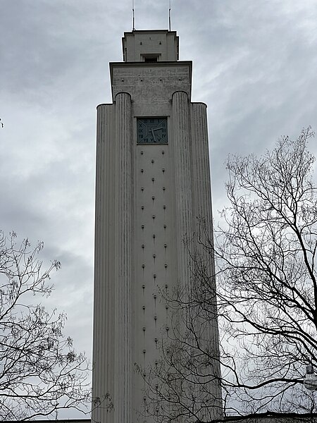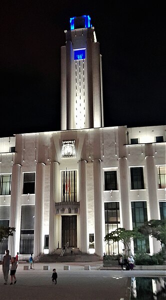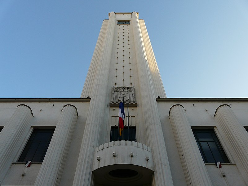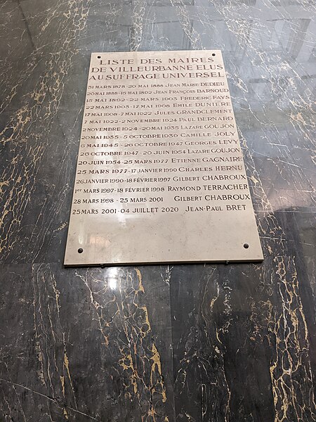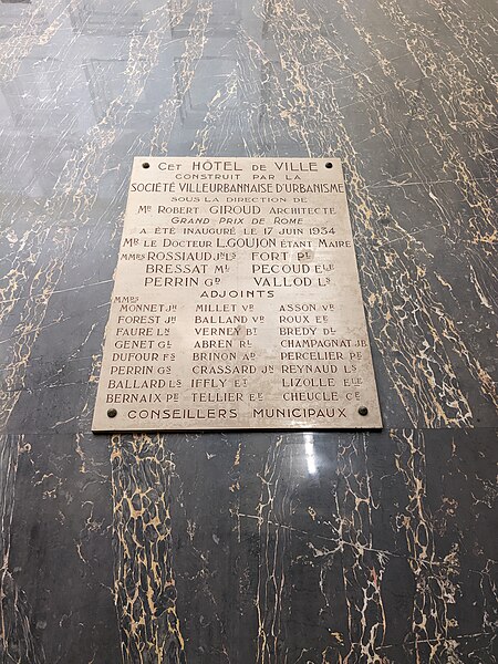 L'hôtel de ville de Villeurbanne, voulu par le maire Lazare Goujon comme nouveau centre urbain en concurrence avec Lyon, s'inscrit dans l'ensemble dit de la "Cité des Gratte-ciel" réalisé par l'architecte Môrice Leroux entre 1931 et 1934. L'édifice, construit entre 1931 et 1934 et inauguré en 1934, a été conçu par Robert Giroud, architecte choisi par concours et premier Grand Prix de Rome en 1922. Élevé en béton armé, il s'organise sur trois étages et se signale par un beffroi carré haut de 65 mètres. Sa façade est rythmée par cinquante colonnes cannelées dépourvues de chapiteaux, expression d'un ordre monumental propre aux années 1930. Le style académique, strict et symétrique de l'édifice mêle courant moderne des années 1930 et quelques emprunts au néoclassicisme. L'intérieur conserve intact son décor d'origine, réalisé en céramique, marbre bleu et noir, acajou, fer et cuivre. L'hôtel de ville est situé 28, rue Aristide-Briand ; il fait face, au nord, à l'avenue Henri-Barbusse et, au sud, à la place Lazare-Goujon et au Théâtre national populaire, et est encadré par la rue Michel-Servet à l'ouest et la rue Paul-Verlaine à l'est. Les façades et toitures, l'escalier principal, les halls et couloirs des premier et deuxième étages, la salle des Mariages et la cheminée de la salle des Commissions sont inscrits au titre des monuments historiques depuis le 29 avril 1991.