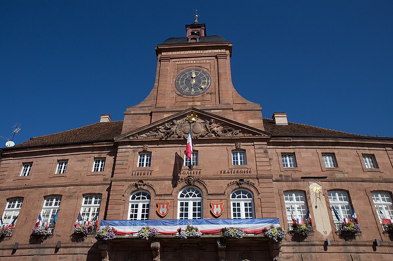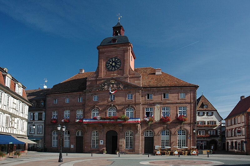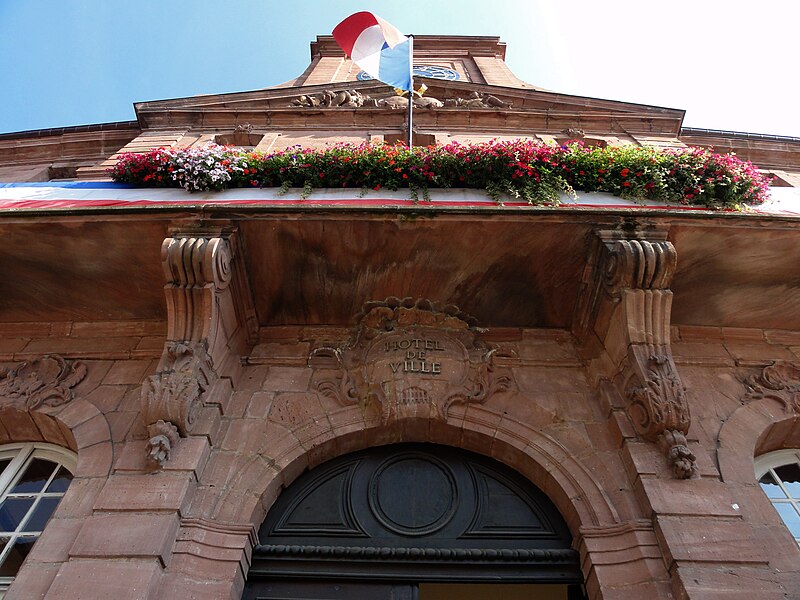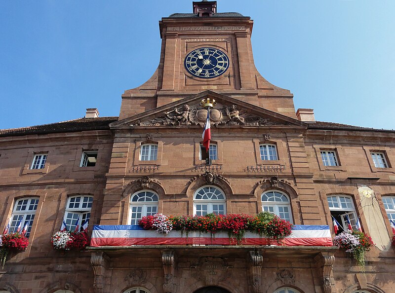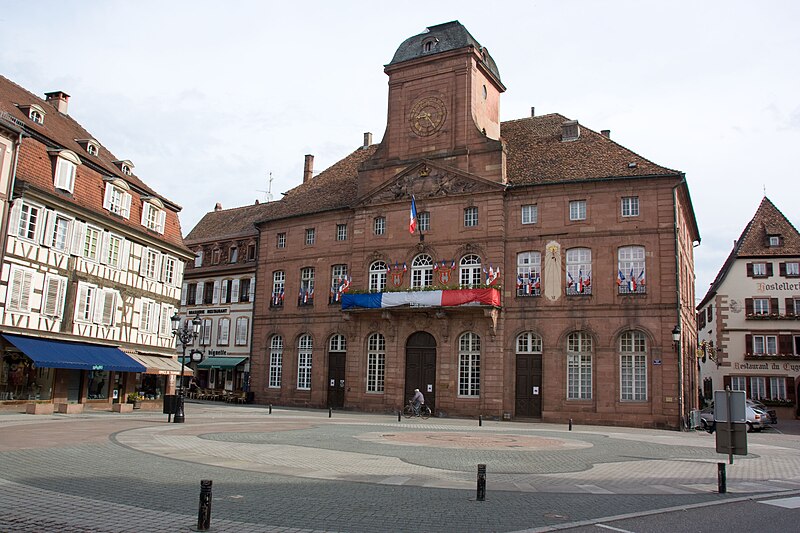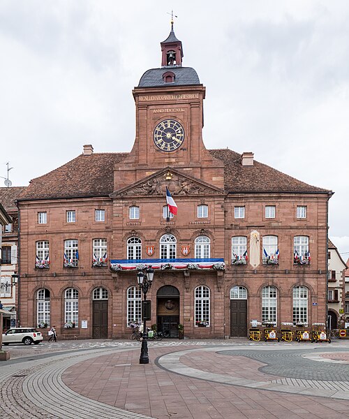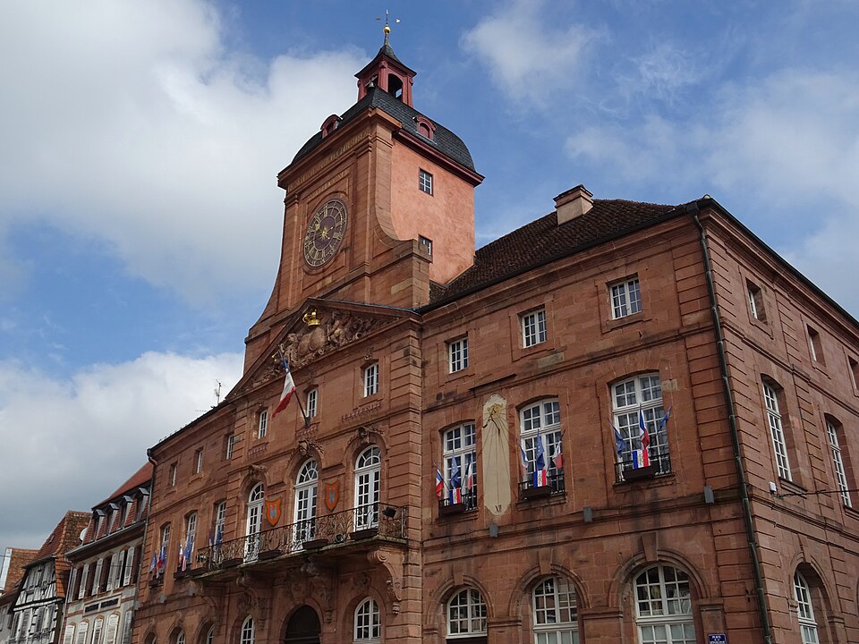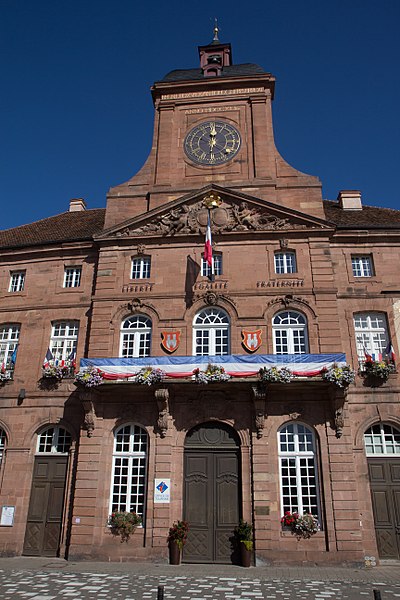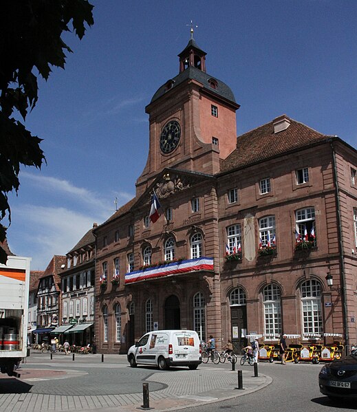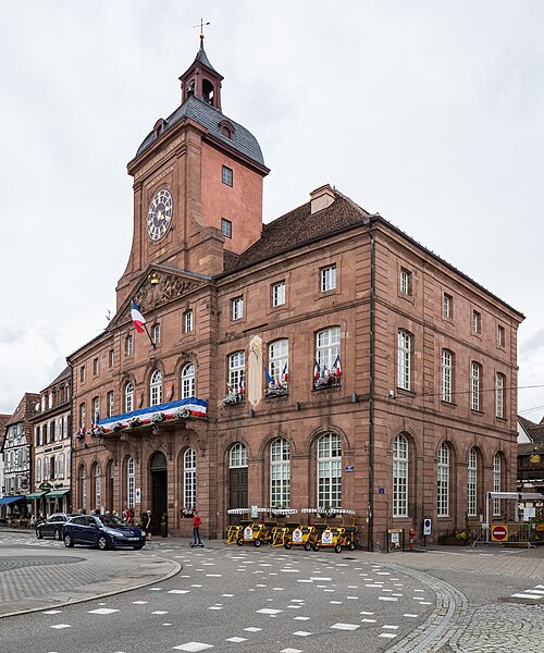 Situé place de la République à Wissembourg, l'hôtel de ville constitue un témoignage de l'architecture publique du milieu du XVIIIe siècle. Construit d'après les plans de l'architecte Joseph Massol, la première pierre fut posée le 26 juin 1741 et l'édifice fut achevé et inauguré le 27 juin 1752. Le niveau supérieur de la tour porte la date MDCCXLI et l'inscription REGNLUDXVEXANTIQUOCINLRESURREXI (Sous le règne de Louis XV, je me suis relevé de mes cendres). L'ancienne maison communale, peut‑être datée de 1396, succomba lors de l'incendie de la ville en 1677 et apparaît sur des vues gravées de Wissembourg des XVIe et XVIIe siècles. Les menuiseries de l'hôtel de ville sont en grande partie d'origine. Pendant la Révolution, le maître maçon Klauer fit enlever les portraits sculptés des rois qui ornaient la salle des séances ; les médaillons stuqués de cette salle ont été ornés en 1988 par Vincent Thiébaut de peintures allégoriques. Une maison imbriquée à l'arrière, dans l'angle nord‑est, fut détruite après la guerre, permettant l'agrandissement du bâtiment selon le plan rectangulaire actuel. L'édifice a été inscrit au titre des monuments historiques en 1929 puis classé en 1932.
