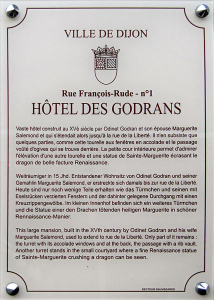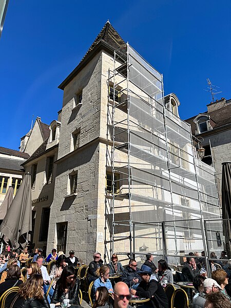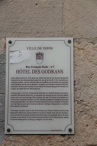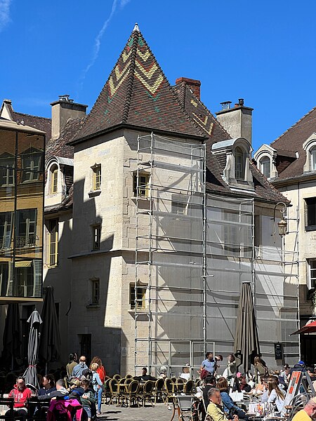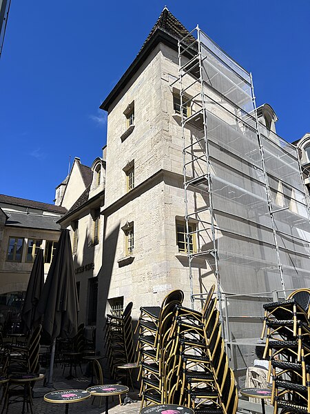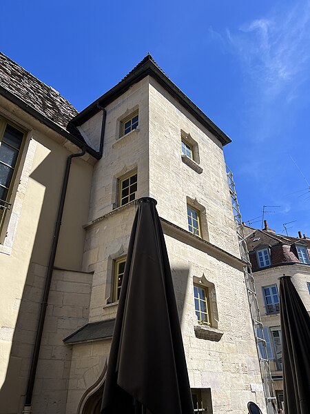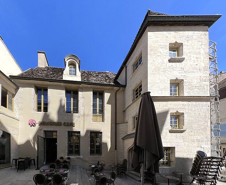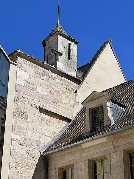 Ensemble formé par la tour de l'escalier, la façade est de la courette, le puits Renaissance, passage voûté conduisant sur la rue François-Rude, façade sur l'impasse jusqu'à quatre mètres de chaque côté des piédroits de la porte cochère, toitures : inscription par arrêté du 28 octobre 1941 ; Bâtiment du XVe siècle avec deux salles couvertes de voûtes d'ogives, ancienne dépendance de l'hôtel : inscription par arrêté du 13 janvier 1947