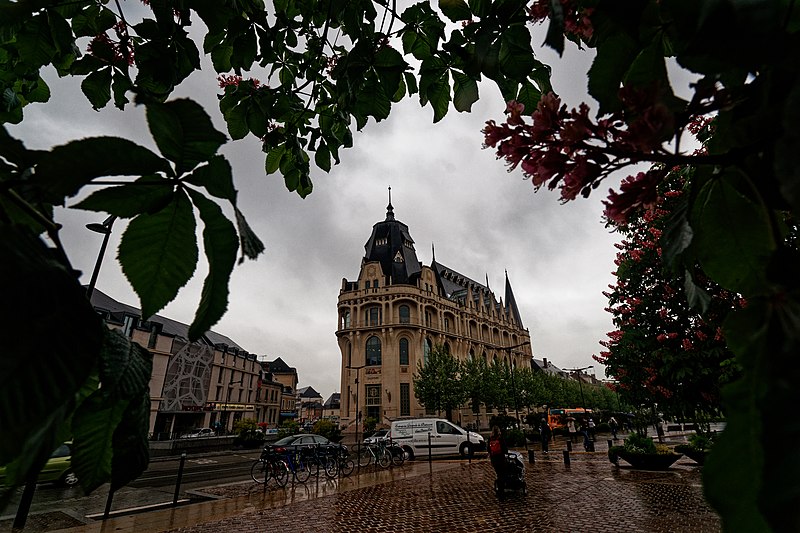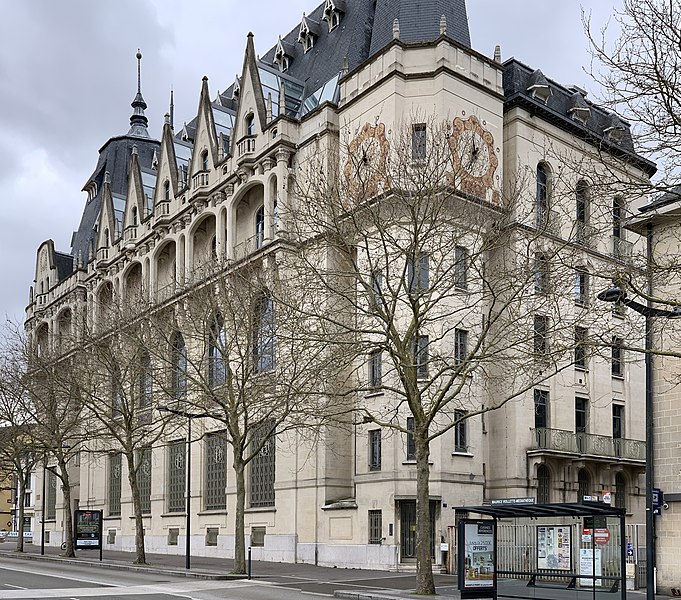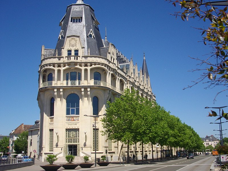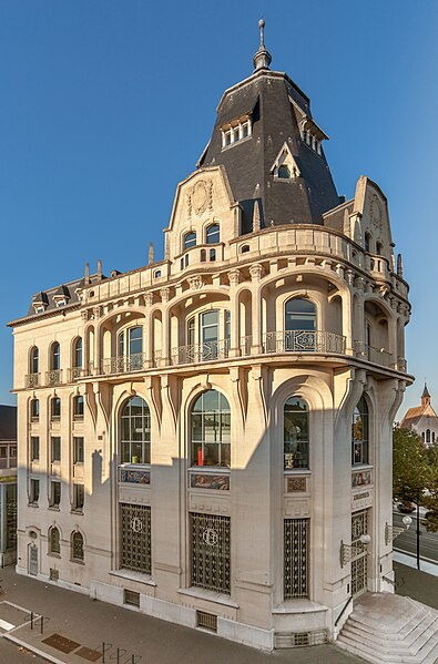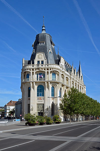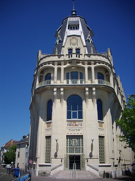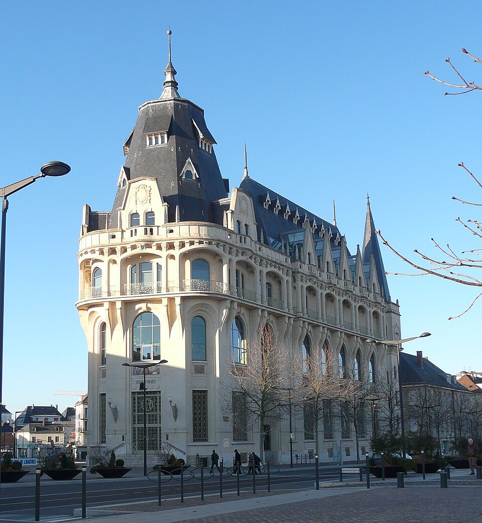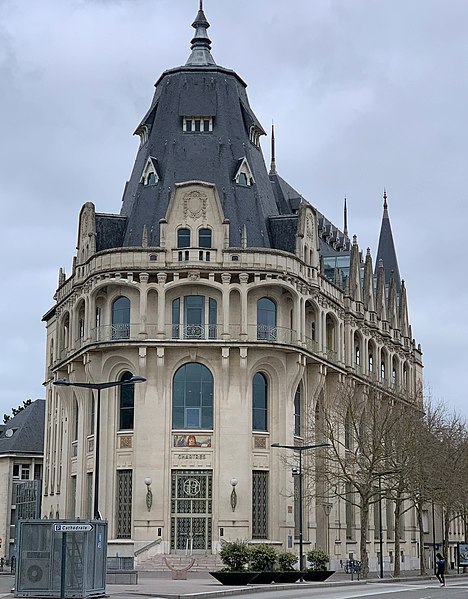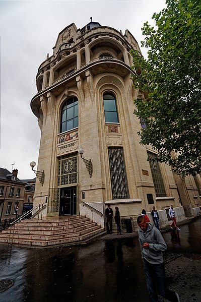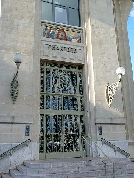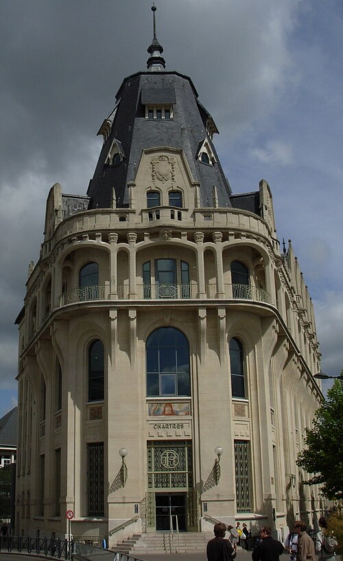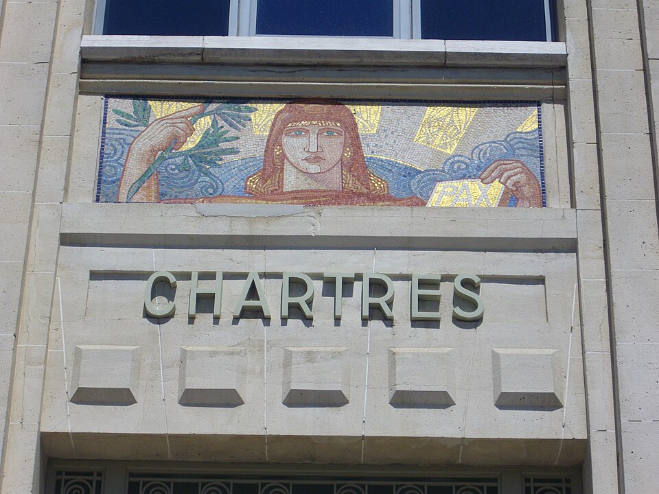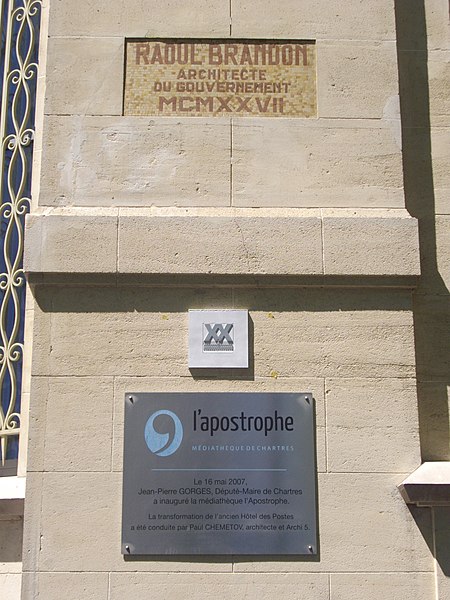 L'Hôtel des Postes de Chartres, situé à l'angle du boulevard Maurice-Viollette et de la rue du Général-Koenig, abrite aujourd'hui la médiathèque l'Apostrophe. Construit de 1923 à 1928 par l'architecte Raoul Brandon dans un style médiéval, le bâtiment a conservé principalement ses façades et ses toitures d'origine. Le corps principal contient la salle de tri ; au nord-est s'élève l'escalier principal à rampe circulaire, logé dans un volume polygonal surmonté d'une flèche, tandis qu'à l'angle opposé un pavillon épouse la courbe de la parcelle. Les bâtiments destinés aux garages ont disparu. Les mosaïques, œuvre d'Édouard Pierre Blin, ornent les façades ; elles sont au nombre de onze, d'inspiration byzantine et réalisées en tesselles de grès. Au‑dessus de l'entrée, une mosaïque représente la Paix tenant un rameau d'olivier et une plaque portant l'inscription « Pax », encadrée par deux compositions montrant trois personnages prêtant serment à la Paix. Sur la rue du Général-Koenig figure une scène d'installateurs accrochant des lignes téléphoniques à un poteau. Le long du boulevard Maurice-Viollette, cinq mosaïques illustrent, de gauche à droite, le transport du courrier par avion, camion, à pied (remise à une paysanne beauceronne), chemin de fer et bateau. Au sommet du renfoncement qui abrite l'ascenseur sont placés les blasons de Chartres et de Paris, accompagnés des devises « Servanti civem querna corona datur » et « Fluctuat nec mergitur ». Des fresques murales réalisées en 1929 par Pierre Vaillant, fils de l'architecte Charles Émile Vaillant (qui avait eu Raoul Brandon comme élève), ornaient la salle destinée au public ; elles représentaient trois scènes de moisson beauceronne et des vues de monuments départementaux, notamment les châteaux de Frazé et d'Anet, mais ont été détruites dans les années 1970. Les façades et les toitures ont été inscrites au titre des monuments historiques en 1994. L'intérieur a été entièrement rénové en 2007 par Paul Chemetov pour permettre l'installation de la médiathèque. En 2016, le bâtiment a reçu le label « Patrimoine du XXe siècle » délivré par le ministère de la Culture. Parmi les éléments intérieurs et extérieurs remarquables figurent la signature mosaïquée de Raoul Brandon, la tour nord, l'horloge, les blasons et devises de Chartres et de Paris, ainsi que la charpente visible au dernier étage.
