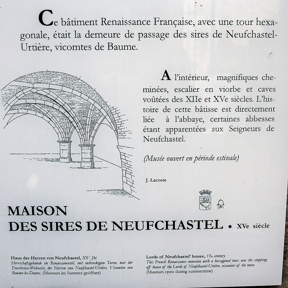 L'hôtel des Sires de Neuchâtel, aussi orthographié Neufchastel, est un hôtel particulier situé sur la place du Général-de-Gaulle, au centre de Baume-les-Dames (Doubs), en Bourgogne-Franche-Comté. Le bâtiment date du XVe siècle et a été remanié au XVIIIe siècle. Il servait de « demeure de passage » aux sires de Neufchastel. Transformé en musée, il abrite aujourd'hui le Musée des Sires de Neufchastel. L'édifice est inscrit au titre des monuments historiques depuis le 23 août 1989. La protection couvre les façades et la toiture du bâtiment du XVe siècle, la tour d'escalier, les caves voûtées d'ogives, la cheminée à hotte au rez-de-chaussée de l'aile nord, ainsi que les lambris et la cheminée du XVIIIe siècle dans la pièce sud de l'étage de l'aile sud. Elle s'étend également à la façade sur la place et à la toiture du bâtiment du XVIIIe siècle. Architecturally, l'hôtel se caractérise par une tour hexagonale contenant un escalier en viorbe et par des caves voûtées d'ogives datées des XIIe et XVe siècles. Un jardin de style Renaissance, avec reconstitution des entrelacs du XVe siècle, complète l'ensemble. Le musée présente des scènes de la vie paysanne et seigneuriale locale.
