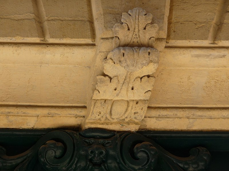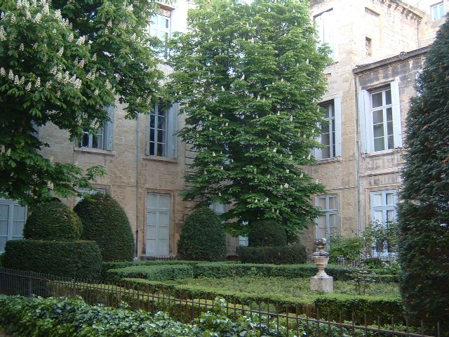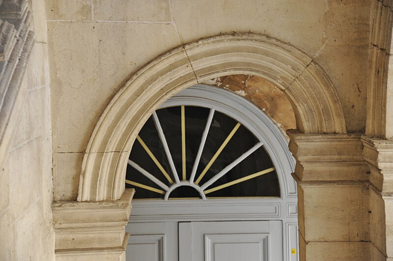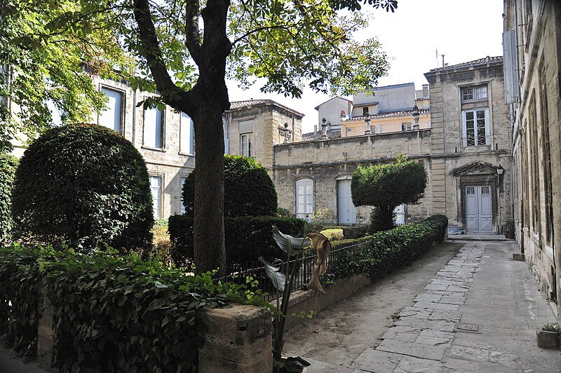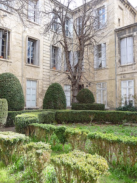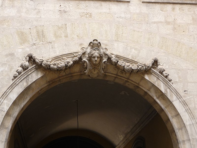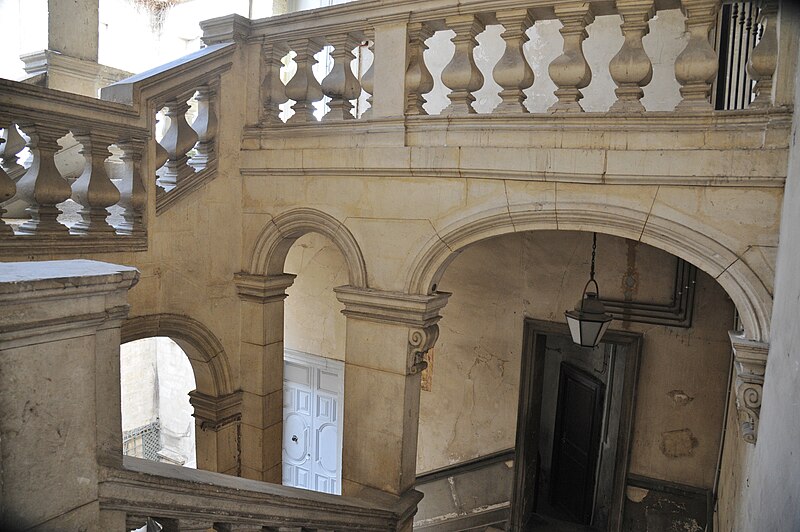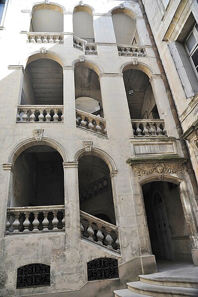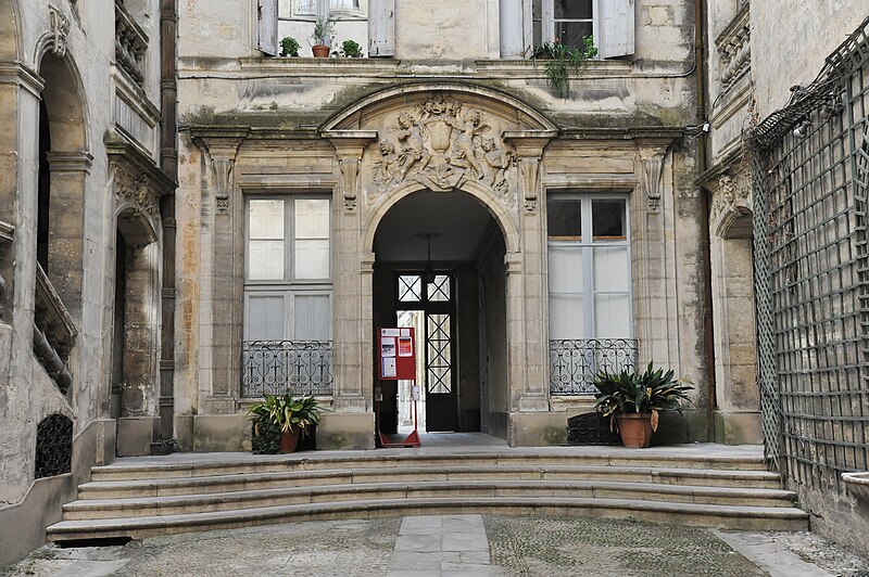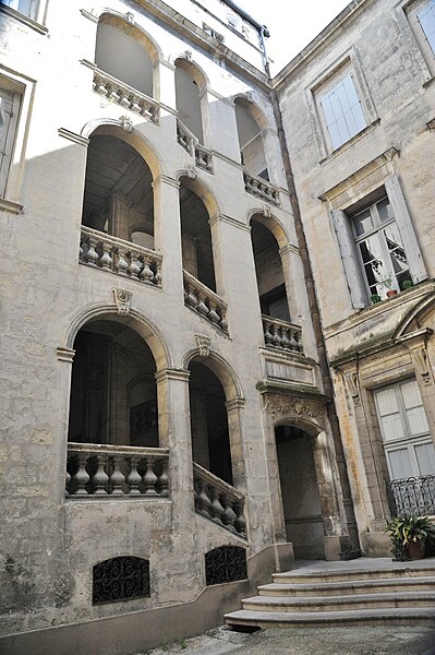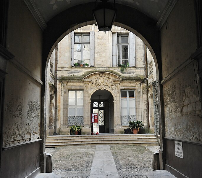 L’entrée se compose d’un portail de style Louis XIV, considéré comme le plus haut de Montpellier, dont la composition maniériste associe un encadrement à refends, des vantaux compartimentés et une imposte richement travaillée. L’accès se fait par une porte en pierre à encadrement avec refends, couronnée d’une corniche ; la clé du chambranle est sculptée en perspective et la porte franchit un porche voûté pour ouvrir sur la cour d’honneur. Un dallage en cailloux roulés borde la cour et le porche et encadre, au centre, un chemin en dalles aboutissant à un emmarchement au fond. Au fond de la cour, une porte à fronton cintré et motif sculpté donne, par une galerie, accès à la seconde cour. À gauche de la cour d’honneur se trouve le grand escalier ; ses balustrades rampantes sont composées d’éléments pris entre les piliers extérieurs et intérieurs, qui supportent le limon au moyen d’arcs rampants. Des pilastres d’ordre corinthien sont adossés aux piles intérieures, leurs chapiteaux ne supportant rien, contribuant à la silhouette sculptée de l’escalier. L’ensemble présente une riche combinaison d’éléments décoratifs et architecturaux témoignant des diverses campagnes de travaux qui ont façonné l’hôtel.