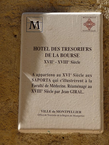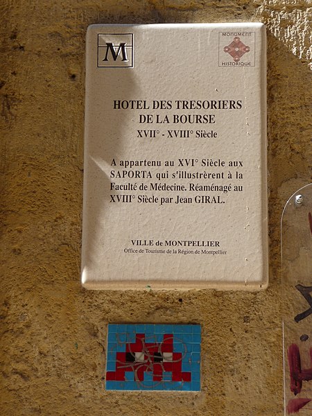 L’hôtel des Trésoriers de la Bourse, ou hôtel de Rodez Bénavent, situé 4 rue des Trésoriers de la Bourse, est le plus vaste hôtel particulier de l’Écusson de Montpellier. L’édifice existait avant le XVIIIe siècle et résulte de la réunion et du remaniement d’anciennes maisons médiévales remembrées. Antoine de Saporta est propriétaire dès 1554. Des rénovations modernes débutent en 1631 pour Daniel de Gallières, suivies de nouveaux travaux en 1652 pour Pierre de Gallières. Vers 1695, Pierre de Sartre conduit une campagne importante qui concerne notamment les bâtiments donnant sur le jardin. Joseph Bonnier de la Mosson acquiert l’immeuble en 1712 et le fait largement remanier, agrandir et embellir par l’architecte Jean Giral ; le corps de bâtiment entre les deux cours aurait été achevé en 1700 et l’escalier d’honneur en 1731. Dans la seconde moitié du XVIIe siècle, Pierre de Sartre, receveur général des deniers de la Bourse du Languedoc, ouvre une longue série de propriétaires qui, jusqu’à la Révolution, transmettent la charge de trésorier avec l’hôtel. Les Bonnier de la Mosson, père et fils, sont parmi les occupants les plus célèbres et organisent des fêtes dans le grand jardin intérieur. Au XIXe siècle, la famille Rodez Bénavent laisse son nom secondaire à la demeure. Les sources divergent quant à la datation précise des travaux : certains attribuent l’essentiel des transformations à la seconde moitié du XVIIe siècle, d’autres les situent au XVIIIe siècle.