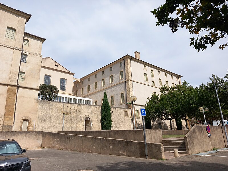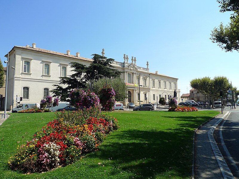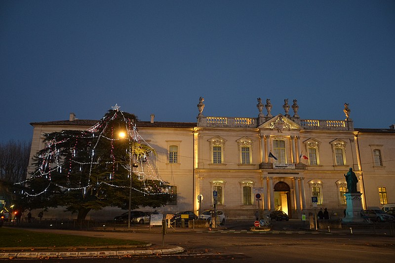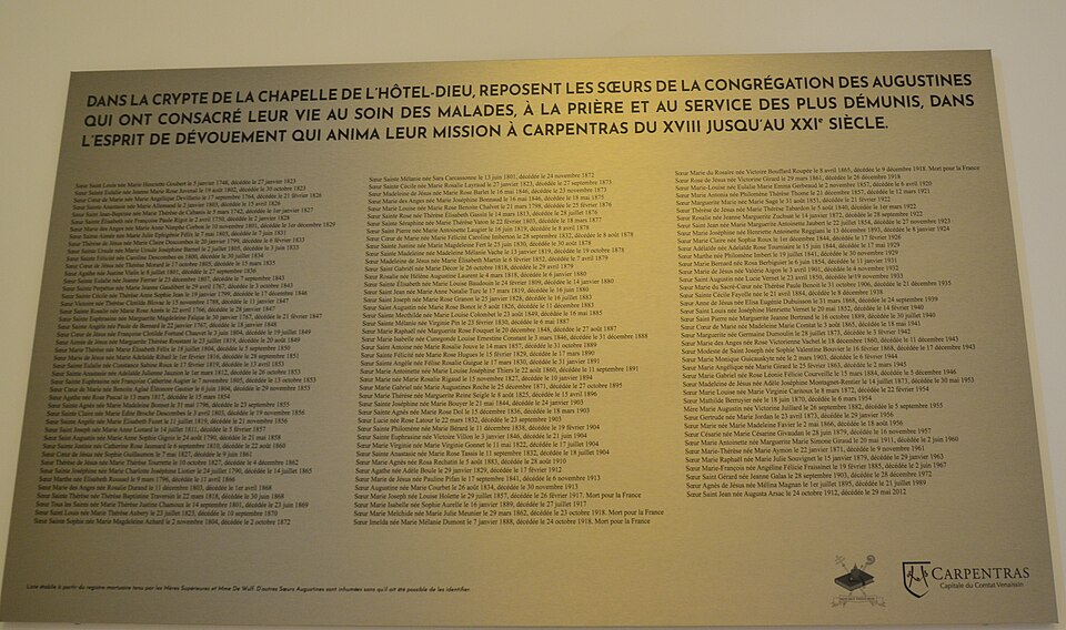 L’Hôtel-Dieu de Carpentras est un hospice bâti au milieu du XVIIIe siècle sur commande de Monseigneur d’Inguimbert et réalisé par l’architecte local Antoine d’Allemand. Les bâtiments, organisés autour d’une cour carrée, s’étagent sur rez-de-chaussée, étage et attique ; l’aile ouest abrite la chapelle où se trouve le tombeau de l’évêque. L’apothicairerie a conservé son décor initial avec des paysages en camaïeu de S. Duplessis et des peintures d’Alexis Peyrotte, ainsi que des pots en faïence provenant d’ateliers de Moustiers, Montpellier, Marseille, Apt et autres centres de faïence, objets aujourd’hui protégés. La façade principale, de style baroque, présente une porte cochère en bois sculpté, un balcon, un fronton orné d’angelots et des colonnades ; la toiture, couverte de tuiles romanes, est bordée d’une rambarde ornée de six pots-à-feu, remplacés par des copies plus légères au milieu du XXe siècle. La construction, commencée en 1750 et achevée en 1762, fut pensée pour offrir des pièces vastes et confortables et fut desservie, selon la volonté de l’évêque, par des sœurs hospitalières à partir de 1764. L’ensemble occupe un quadrilatère de cent mètres sur quatre-vingts, réparti autour de quatre cours et de deux jardins, le côté est étant destiné aux malades et le côté ouest aux religieuses. Les matériaux employés proviennent de carrières et d’ateliers locaux : pierres de Rocan, Caromb, Oppède, Saint-Didier, Villeneuve-lès-Avignon, Barroux et Beaumes‑de‑Venise, plâtres de La Roque‑sur‑Pernes et Mormoiron, tuiles et carrelages de Venasque et Montfaucon, briques de Bédoin et charpente en sapin de Tournon avec liteaux d’Andance. La porte principale ouvre sur la cour d’honneur, autrefois plantée, aujourd’hui occupée en saison par le marché aux truffes ; seules deux fontaines d’origine subsistent. L’entrée d’honneur comprend un hall, un escalier monumental et deux galeries ornées des panneaux de donateurs ; les vitraux du hall et la statue de la Vierge sur le palier ont été intégrés lors des travaux financés par Isidore Moricelly. Le plan initial de l’escalier, prévu comme une rampe droite, fut modifié pour créer un escalier central monumental de soixante-quinze marches en pierre de Caromb, avec rampes en fer forgé réalisées par les frères Mille. La chapelle, située dans l’angle nord‑ouest, est une nef simple voûtée avec abside ; son décor baroque fait une large place au marbre polychrome, et l’autel est en marbre ; s’y trouvent le monument funéraire de Mgr d’Inguimbert sculpté par Étienne Dantoine et le tombeau d’Isidore Moricelly sculpté par Émile Aldebert, tandis qu’une crypte accueille les religieuses inhumées. La pharmacie, aménagée entre 1750 et 1760, conserve son mobilier d’origine composé de droguiers à cent soixante-dix-huit tiroirs, avec décors dus en partie à Peyrotte et des peintures de Duplessis, et elle a longtemps servi aussi d’officine pour la population. Les salles de malades, prêtes dès 1762, occupaient la longueur des ailes et se caractérisaient à l’origine par de hauts plafonds et des voûtes en berceau ; l’organisation des espaces répondait aux préoccupations prophylactiques de l’époque. L’administration initiale prévue de douze recteurs fut remplacée par un conseil de neuf membres présidé par le maire, et la communauté des sœurs augustines, fondée par d’Inguimbert, assura pendant des siècles l’accueil et les soins avant de s’éloigner puis de revenir jusqu’à son départ définitif en 1976. Un incendie en 1847 détruisit la quasi‑totalité de la toiture et endommagea l’escalier et le hall d’honneur ; les réparations furent conduites grâce à des souscriptions et à des restaurations ultérieures, notamment celles financées par Isidore Moricelly. Le legs de Moricelly permit aussi la création, en annexe de l’hôtel-Dieu, d’une clinique d’accouchement inaugurée en 1934 ; cet ensemble hospitalier fonctionna jusqu’au transfert des services vers le nouveau pôle santé en 2002. Classé monument historique dès 1862, l’hôtel‑Dieu et une grande partie de ses mobiliers et objets (dont de nombreuses pièces de la pharmacie) bénéficient de protections au titre des monuments et des objets historiques. Après d’importantes opérations de restauration et d’aménagement, les locaux ont été réaménagés pour accueillir la Bibliothèque Inguimbertine ; la bibliothèque a été inaugurée dans ces lieux et la partie muséale a été ouverte au public. Aujourd’hui, l’Hôtel‑Dieu reste un lieu culturel vivant : sa cour reçoit le marché aux truffes de Carpentras et l’ensemble accueille expositions, concerts et manifestations estivales.