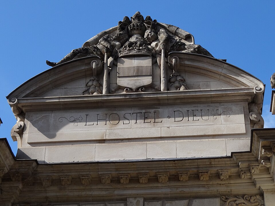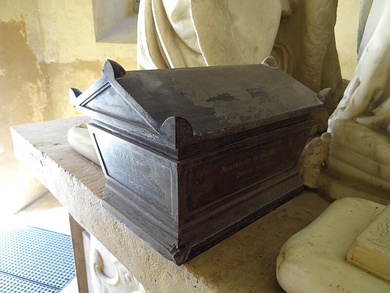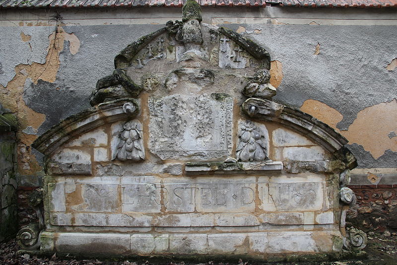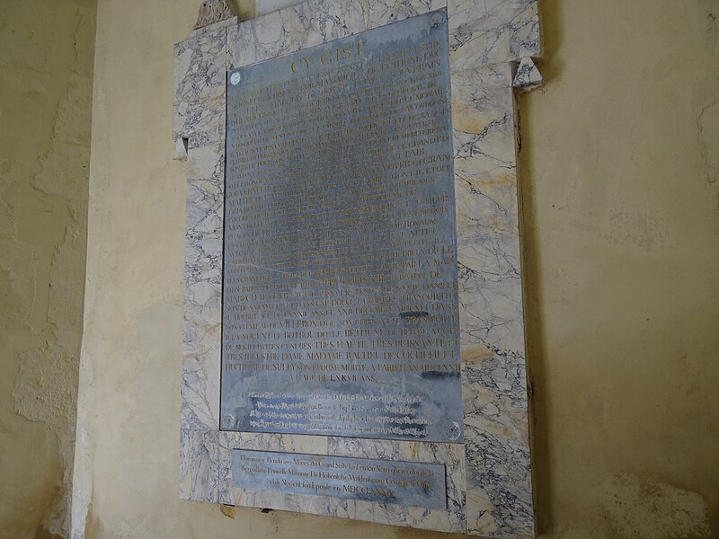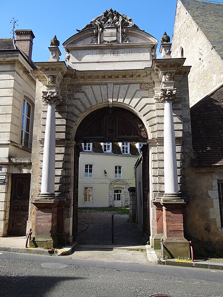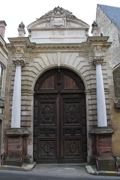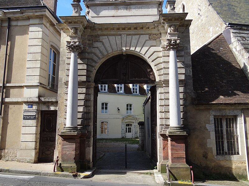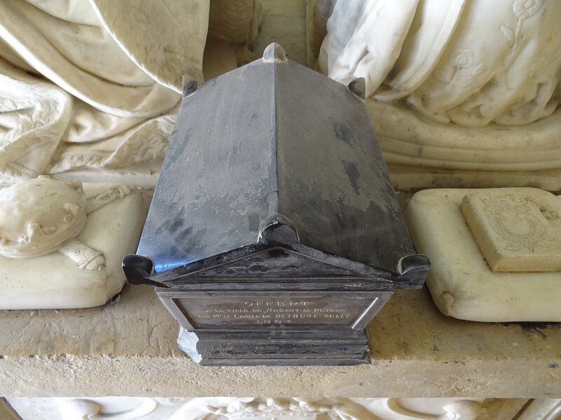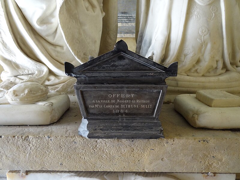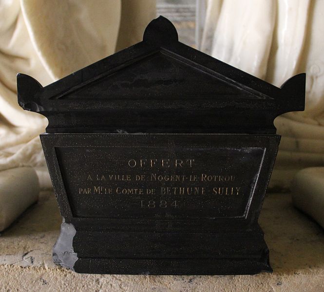 L'hôtel-Dieu fut fondé en 1182 à Nogent-le-Rotrou, lieu de passage sur le chemin de Compostelle. Au XVIIe siècle, il se composait d'une agglomération de petites maisons indépendantes disposées autour de la chapelle. En 1641, Sully choisit d'y être inhumé en dehors de l'église en raison de sa confession réformée. Sa veuve, Rachel de Cochefilet, fit élever un mausolée couvert d'ardoise et orné d'une branche de lys ; il abrite le tombeau et les priants sculptés par Baudin. En 1643 fut commandée la construction du portail donnant accès au tombeau. Entre 1728 et 1732, la salle des hommes fut construite à l'emplacement de la maison des Voûtes, puis, à partir de 1772, la salle des femmes fut élevée en continuité ; c'est dans ce bâtiment principal que fut aménagé l'oratoire particulier de l'hôtel-Dieu. Le bâtiment B, sur cour, accueillait la pharmacie et le dortoir des sœurs de Saint-Vincent-de-Paul, qui dirigeaient l'établissement depuis 1672 ; ce bâtiment fut modifié et agrandi en 1861. En 1818 fut créé un hospice pour vieillards, dit "hôpital des Bonshommes" (emplacement du bâtiment C), entièrement reconstruit en 1861. Les travaux se poursuivirent jusqu'en 1866 sous la direction de l'architecte Lebart : on rehaussa le corps principal d'un étage et l'on édifia un avant-corps à l'est pour des salles de bain alimentées en eau courante. En 1868, une tourelle d'escalier fut élevée sur la façade ouest. Un hôpital militaire fut créé en 1878, en partie dans l'aile D et dans l'aile sur rue, et l'établissement s'agrandit encore en 1933 par la création de la maternité. L'édicule fut endommagé pendant la Révolution et restauré en 1897, en même temps que l'ensemble du portail.