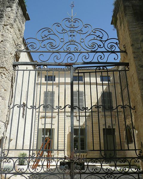 Selon des auteurs locaux, cet emplacement abritait l'ancien hôtel de ville et l'église Saint-Laurent, la seule église qui, au XVIIe siècle, avait résisté aux guerres de Religion. En 1763, un incendie provoqué par la chute de la foudre sur des barils de poudre détruisit l'hôtel de ville, qui fut reconstruit à un autre emplacement. Le terrain de l'ancien hôtel de ville fut cédé à un particulier vers 1765-1780, et la construction de cet immeuble pourrait remonter à la même période, notamment la grille d'entrée et les pilastres qui l'encadrent. La façade se compose de deux parties : à gauche, une grande entrée s'ouvre sur une cour au fond de laquelle s'élèvent les bâtiments d'habitation ; à droite se trouve l'ancienne chapelle. Le portail est logé au fond d'une large alvéole encadrée de pilastres ornés de pots à feu. La grille, de style flamand, est faite de barreaux droits dont certains se prolongent vers le haut pour se recourber en spirales affrontées ; des demi-spirales alternées entretoisent les barreaux en leur milieu. Au-dessus, la partie dormante commence par une rangée de rinceaux formés de volutes en S reliées par un œil. Le fronton présente de larges volutes en C, ramifiées et disposées symétriquement autour d'un axe central marqué par un fleuron. La partie basse des vantaux est également décorée de volutes. La façade de l'ancienne chapelle est rythmée par de grands pilastres ioniques à dosserets, dont les chapiteaux sont sculptés.