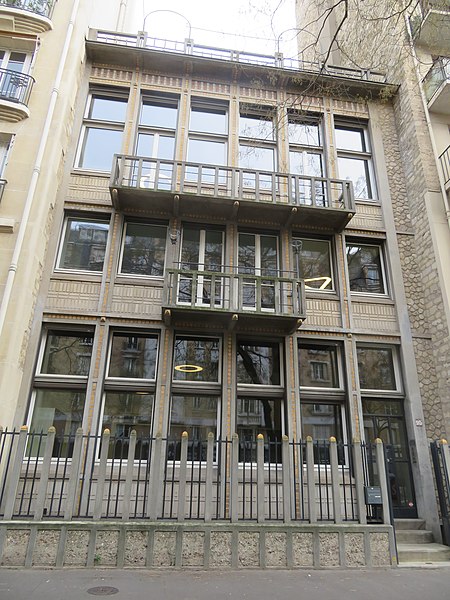 L'hôtel particulier, construit en 1912 par Paul Guadet, l'un des "apôtres" du béton armé, a été édifié pour son usage personnel en collaboration avec l'entreprise des frères Perret, la Société des Grands Travaux en Béton Armé. L'édifice repose sur une ossature en béton armé et comporte un jardin suspendu sur le toit-terrasse. En 1922, une extension destinée à créer un garage a été réalisée, donnant sur la rue Erlanger (rue du Général-Delestraint). Transformé en bureaux, l'hôtel conserve néanmoins quelques vestiges de son décor intérieur d'origine : cinq cheminées ornées de mosaïques et de céramiques, la rampe en fer forgé de l'escalier et un panneau mural en mosaïque mauresque.