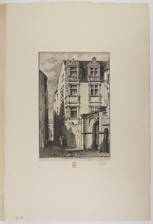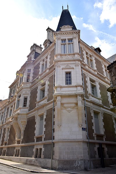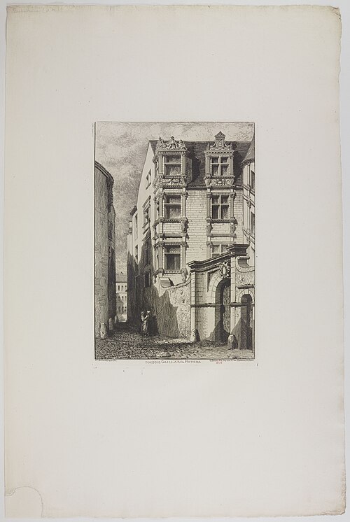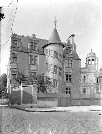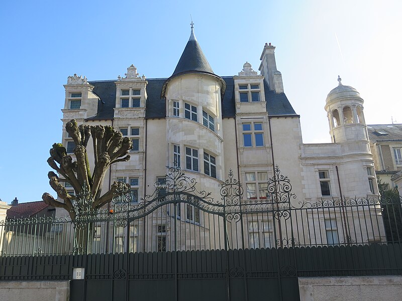 La façade, de style renaissant, est remarquable par sa tour d'escalier pittoresque, une lucarne d'angle et une tour décorative couronnée d'une coupole ajoutée au XIXe siècle. Le décor reprend des motifs typiques de la Renaissance, comparables à ceux du château de Bonnivet près de Poitiers: lucarnes, frontons, pilastres, balustres, médaillons et bustes d'empereurs romains, mascarons, rinceaux et décors floraux. La maîtrise des sculpteurs apparaît particulièrement à l'angle donnant sur la rue du Puygarreau, où consoles, mascarons, pilastres et corniches sont traités en fausse perspective pour accentuer leur saillie.