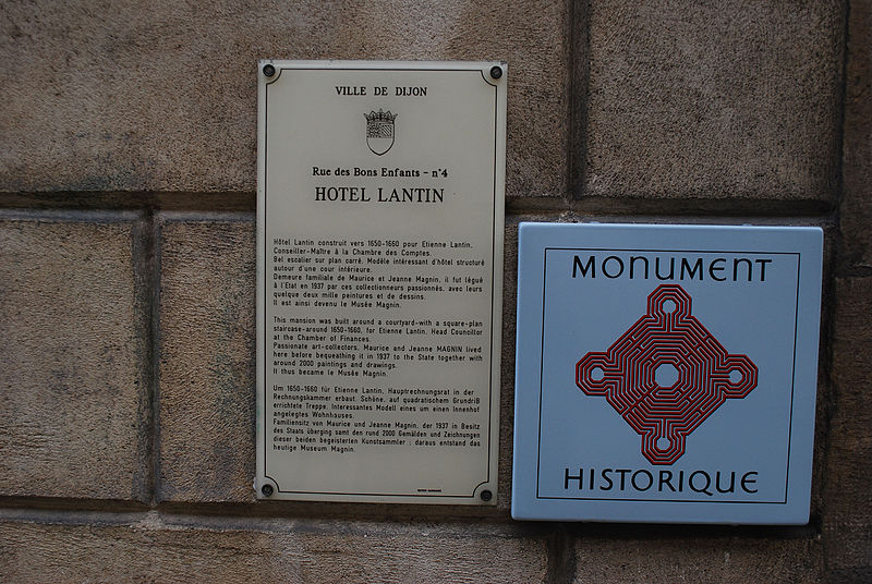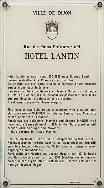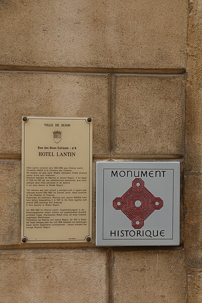 En 1652, Étienne Lantin, conseiller maître à la chambre des comptes de Bourgogne, hérite de l’emplacement du 4 rue des Bons-Enfants et fait édifier la demeure en pierre rose, achevée en 1664, dans le centre historique entre la place de la Libération (palais des ducs de Bourgogne) et le parlement de Dijon. La maison se compose d’une enfilade de pièces organisées autour d’une cour intérieure et présente une salle zénithale ainsi qu’un escalier monumental en pierre, surmonté d’un dôme octogonal richement décoré.
