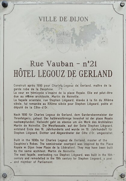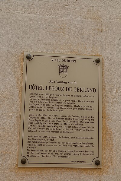 L'hôtel Legouz de Gerland est un hôtel particulier de styles Renaissance, classique et XIXe siècle, situé 21 rue Vauban à Dijon (Côte-d'Or). La partie la plus ancienne, le long de l'actuelle rue Jean-Baptiste-Liégeard, a été édifiée en 1538 par la famille Chissey-Varanges et ornée de trois échauguettes rappelant les tours de ses armoiries. Dans les années 1670, Pierre Legouz Morin fit prolonger la façade et ajouta, à l'angle des rues Jean-Baptiste-Liégeard et Amiral-Roussin, une échauguette sur le modèle des précédentes. Vers 1698, son fils Charles Legouz Morin, maître de la garde-robe de la dauphine, fit aménager du côté de la rue Vauban une cour en hémicycle percée de huit arcades et décorée de guirlandes, de motifs floraux et du monogramme du propriétaire, s'inspirant de l'hémicycle de la place Royale voisine. Au XIXe siècle, l'hôtel fut acquis par Jean-Baptiste Liégeard ; à sa mort en 1887 il revint à son fils Stéphen Liégeard, qui apposa ses initiales au-dessus du portail et fit unifier certaines façades, notamment celles donnant sur les rues Jean-Baptiste-Liégeard et Amiral-Roussin. Après le décès de Stéphen Liégeard en 1925, la propriété passa à son fils Gaston Liégeard, puis, après la disparition de celui-ci, au comte de Saint-Quentin ; l'édifice appartient aujourd'hui à plusieurs propriétaires. Le bâtiment est inscrit au titre des monuments historiques depuis le 10 novembre 1925. Parmi les éléments remarquables visibles figurent le portail d'entrée sur la rue Vauban, la cour en hémicycle, la façade Renaissance de la rue Jean-Baptiste-Liégeard, la façade sur la rue Amiral-Roussin, l'échauguette d'angle et une plaque d'information trilingue.