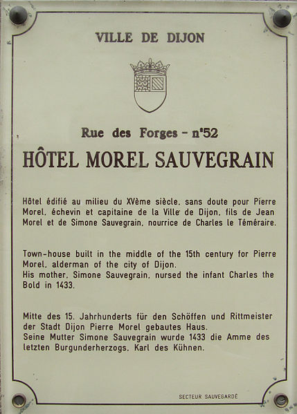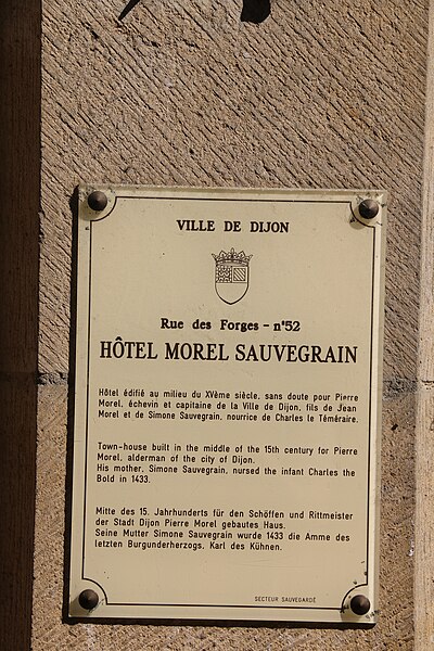 L'ancien hôtel de Rochefort, dit hôtel Morel-Sauvegrain, est un hôtel particulier situé 52-54-56 rue des Forges à Dijon, dans le secteur sauvegardé. Il a été construit au milieu du XVe siècle par Jean Morel, échevin et capitaine de la ville, et sa femme Simone Sauvegrain, issue d'une famille influente à la cour ducale; Simone fut nourrice de Charles le Téméraire en 1433. Les bâtiments, initialement réunis, s'élèvent le long de l'ancienne voie nord-sud, autrefois très commerçante. Après 1513, l'hôtel a été divisé en trois habitations indépendantes, mais l'unité primitive reste lisible depuis la rue des Forges. Les immeubles des nos 54 et 56 conservent, malgré des adjonctions au XIXe siècle, des éléments des XVe et XVIe siècles, notamment des tourelles à escalier en vis et des fenêtres à meneaux. La façade sur cour de l'hôtel Gerland (n°56) est remarquable : au premier étage figurent des sculptures représentant des scènes de combat entre cavaliers et fantassins, inspirées de gravures italiennes de sarcophages antiques, et au deuxième étage des putti présentent des écussons entourés du cordon de l'ordre de Saint-Michel. L'ensemble est partiellement classé aux monuments historiques, avec des protections datées de 1916 et de 1998.