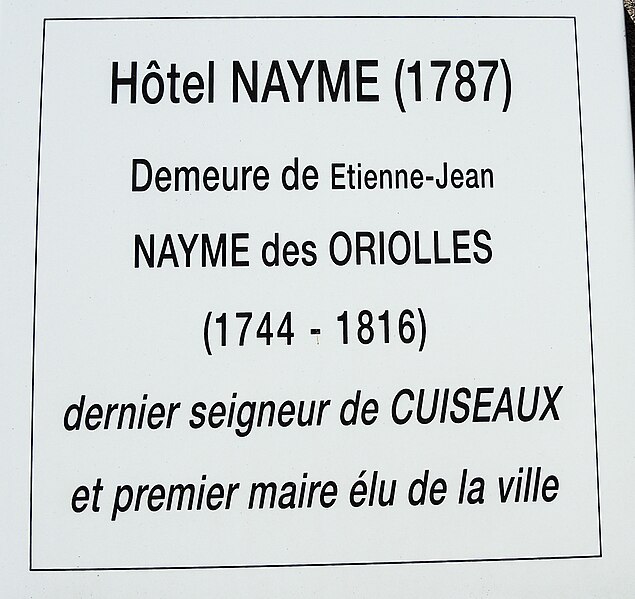 L'hôtel Nayme est un hôtel particulier situé à Cuiseaux, dans le département de Saône-et-Loire, en Bourgogne-Franche-Comté. Il fait l'objet d'une inscription au titre des monuments historiques depuis le 3 janvier 1989. La notice disponible est une ébauche concernant la Bourgogne et les monuments historiques français. Pour plus d'informations, on peut se référer au portail de Saône-et-Loire et au portail des monuments historiques français. Voir également la liste des monuments historiques de Saône-et-Loire.