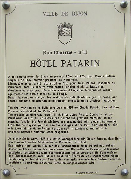 L'Hôtel Patarin est un hôtel particulier situé à Dijon, dans le département de la Côte-d'Or, au cœur du secteur sauvegardé de la ville. La porte donnant sur la rue est inscrite aux monuments historiques depuis 1972. La cour intérieure présente une statue et une plaque d'information trilingue (français, anglais, allemand).