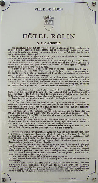 L'hôtel Nicolas Rolin est un hôtel particulier situé 8 rue Jeannin à Dijon, dans son secteur sauvegardé. Il a été construit vers 1440 pour le chancelier Rolin sur la route de Langres, alors rue Saint-Nicolas (actuelle rue Jean-Jacques Rousseau). Du premier bâtiment subsistent une grande salle avec cheminée, des niches murales et une partie de la chapelle. En 1499, Marguerite Rolin et Gaspard de Taralu, héritiers du chancelier, le vendent à la municipalité qui y installe l'hôtel de ville jusqu'en 1831. La chapelle de l'hôtel de ville y est consacrée en mai 1548. La façade donnant sur la rue Jeannin est reconstruite en 1669-1670, puis la salle du conseil est redécorée en 1680-1683. L'architecte Jacques Gabriel entreprend la refonte de l'avant-corps central, du hall à colonnes et du grand escalier entre 1707 et 1714. La municipalité fait construire, le long de la rue, une aile destinée au Bureau des pauvres en 1712-1715. L'acquisition en 1758 de l'hôtel Bernardon permet d'agrandir les prisons et d'aménager des espaces pour les archives. Wolfgang Amadeus Mozart s'y produit en concert le 18 juillet 1766. Le cachot noir, dit "Galbanum", était souterrain et réservé aux condamnés à mort ; avec les anciennes cellules, les nouvelles prisons pouvaient accueillir 120 détenus. En 1832, le département de la Côte-d'Or acquiert l'hôtel pour y installer les archives départementales après le transfert de l'hôtel de ville au Palais Ducal, ce qui entraîne des modifications intérieures. En 1839, les prisons, devenues militaires, sont transférées à la caserne Dampierre et les vieux bâtiments sont détruits. Une restauration menée entre 1990 et 1996 a permis de réhabiliter certaines parties anciennes. L'édifice est inscrit et en partie classé au titre des monuments historiques depuis 1947. Le site comporte une plaque d'information trilingue (français, anglais, allemand), une plaque commémorative du concert donné par Mozart et une plaque en hommage à Pierre Jeannin. L'intérieur présente l'escalier, la salle de lecture des archives départementales — ancienne salle du conseil municipal — ainsi que des détails de cheminée, de statues et du plafond à caissons, et il s'ouvre sur une cour intérieure.