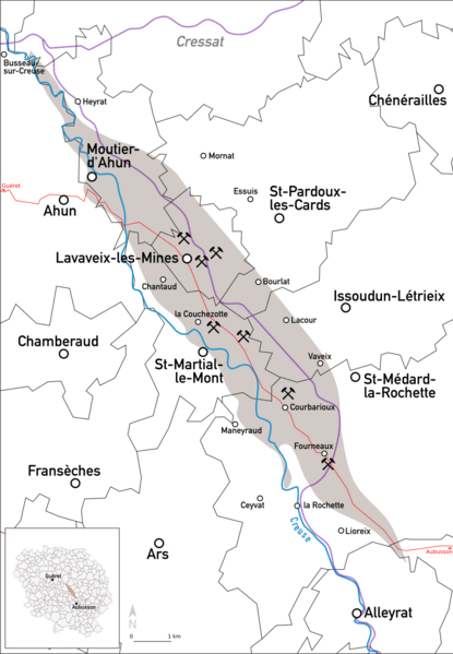 Les houillères d'Ahun regroupent les anciens ouvrages du bassin houiller d'Ahun‑Lavaveix, situés principalement sur les communes de Lavaveix‑les‑Mines et Saint‑Médard‑la‑Rochette, près d'Ahun, dans le centre du département de la Creuse. Le bassin s'étire sur environ 14 kilomètres de longueur pour une largeur moyenne de 1,5 kilomètre et couvre près de 25 km2 répartis sur sept communes. Il s'agit d'un bassin d'effondrement post‑hercynien, bordé par le massif granitique de Guéret et traversé par la rivière Creuse; le territoire s'inscrit dans l'unité paysagère des collines d'Aubusson‑Bellegarde. Les formations carbonifères se composent de grès, de schistes et de couches charbonneuses d'une épaisseur maximale de 350 mètres, où se superposent dix‑huit couches de charbon, dont trois présentent un caractère économique avec des puissances de 0,5 à 6 mètres; certaines affleurent à l'est du bassin. L'exploitation charbonnière remonte au Moyen Âge, avec des indices d'extraction artisanale dès le XIIIe siècle et des sources écrites à partir du XVIIe siècle, notamment aux secteurs de La Vaveix au nord et de Courbarioux‑Fourneaux au sud. La réglementation royale introduite en 1774 a conduit, à la fin du XVIIIe siècle, à la concession de gisements à des propriétaires, puis à une exploitation plus organisée au XIXe siècle, marquée par la création successive de sociétés et par la loi de 1810 relative aux mines. L'entrée de capitaux parisiens à partir de 1856 a permis d'importants investissements et, en 1863, les concessions furent réunies sous la Société anonyme des Houillères d'Ahun, qui développa et modernisa les installations. Le bassin se développa au tournant du XIXe et du XXe siècle : fours à coke, lavoirs, laboratoires, ateliers et logements ouvriers furent implantés, et l'arrivée du chemin de fer facilita l'essor industriel et l'implantation d'activités connexes. Vers 1870‑1872, l'exploitation comptait une soixantaine de fours à coke et l'année 1874 marqua un pic d'extraction avec 354 000 tonnes. Malgré ces avancées, la productivité déclina à partir de la fin des années 1870 et la société connut des difficultés structurelles, ponctuées de mouvements sociaux en 1877, 1914 et 1927‑1928. La concession Nord fut fermée en 1928 et de nombreux puits abandonnés furent rapidement inondés; la compagnie tenta ensuite des diversifications et des gestions temporaires de concessions extérieures sans succès durable. Après la Seconde Guerre mondiale, la production connut une reprise limitée: la concession Nord fut relouée en 1945 à une société d'exploitation, mais le bassin, de faible rendement, ne fut pas intégré au programme de nationalisations de 1946. La dernière descente dans les puits de la concession Sud eut lieu le 31 mars 1961; l'activité se poursuivit au Nord jusqu'à une interruption en 1968 puis une fermeture définitive le 28 février 1969. Au total, le bassin a compté 210 ouvrages miniers au cours de son histoire, et l'appellation « houillères d'Ahun » désigne la société privée qui exploita ces puits de 1863 à 1969, sans nationalisation. Après la cessation de l'exploitation, les sites furent largement abandonnés et la société d'exploitation fit l'objet d'une radiation en 1976; la Société anonyme des Houillères a maintenu une existence juridique jusqu'à sa liquidation judiciaire prononcée le 8 mars 2005, suivie du transfert du fonds d'archives aux Archives départementales. Le passé minier a généré un risque d'affaissements qui a conduit à l'élaboration d'un Plan de prévention des risques miniers prescrit le 14 novembre 2000, à un inventaire des infrastructures en 2005 et à des campagnes de sondage et de sécurisation engagées à partir de 2006; ces opérations ont entraîné la disparition de la plupart des chevalements et la sécurisation ou la destruction d'anciens puits, de sorte qu'en 2006 il ne restait qu'une quarantaine des 210 sites historiques. Une partie des bâtiments a été inscrite à l'Inventaire supplémentaire des monuments historiques le 13 juillet 2006, et des actions de valorisation ont été mises en œuvre localement : parcours d'interprétation à Lavaveix, réhabilitation d'anciens ateliers soutenue par la Fondation du patrimoine et accueil d'activités économiques orientées vers le développement durable, ainsi que la création d'espaces de cotravail et de tiers‑lieux à partir de 2017. Ces démarches témoignent d'une volonté de concilier gestion des risques, conservation des vestiges et reconversion économique du patrimoine minier.