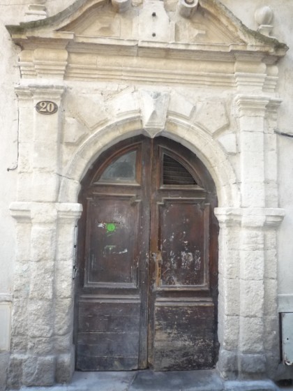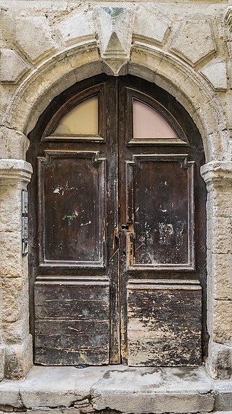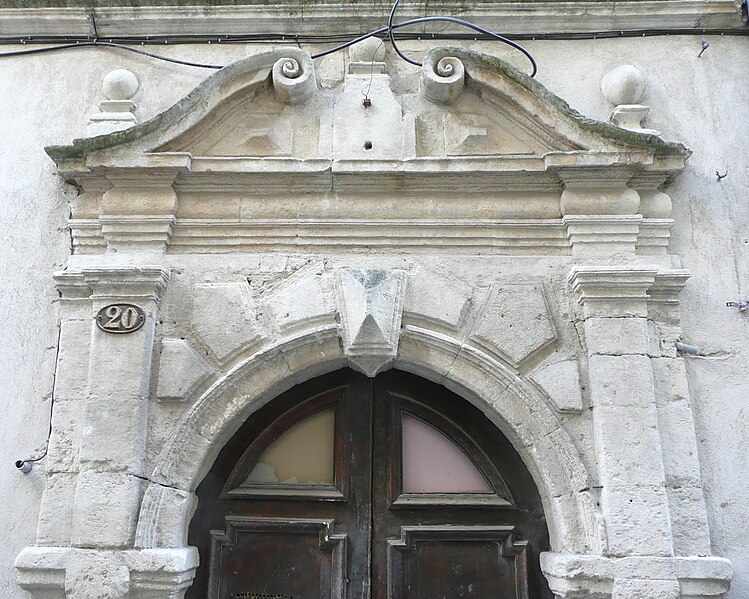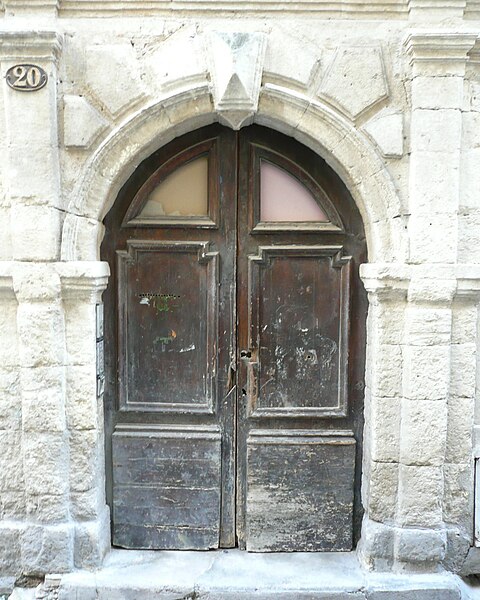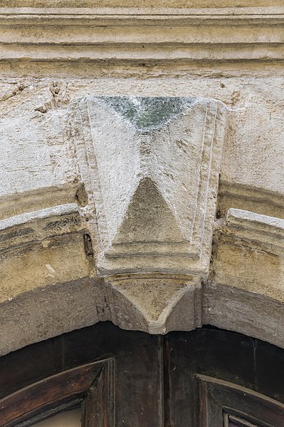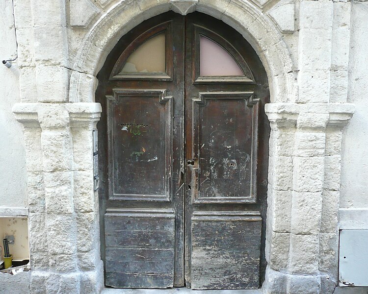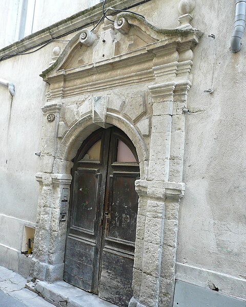 Un immeuble existait au XVIe siècle et a été reconstruit en 1626. Le portail d'entrée présente une ouverture plein cintre dont l'encadrement intérieur, à larges moulures, est interrompu par la saillie d'une grande clé en pyramide et par les bandeaux moulurés des impostes. Autour de l'ouverture s'alignent des bossages polygonaux, aux contours variés mais symétriques, qui dessinent un extrados en échelons. Des pilastres nus supportent les impostes, une mouluration d'architrave, une frise bombée et un entablement à larmier. Au‑dessus, un fronton rompu à inflexions encadre un tableau saillant et nu, surmonté d'une boule. D'autres boules ornent les rampants, à l'extérieur de l'alignement des pilastres, et dans les écoinçons se détachent deux bossages en trémie, tronqués.
