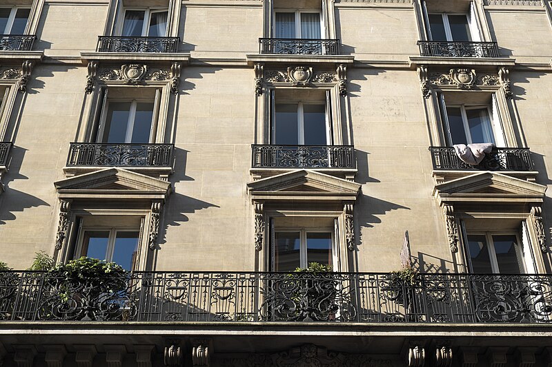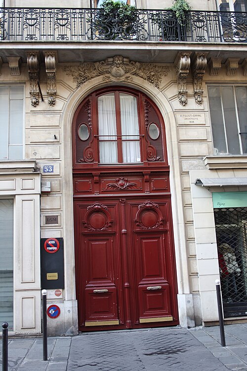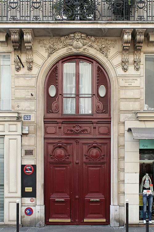 Immeuble conçu par l'architecte Alfred Foliot‑Sinval dont la façade reflète l'esthétique de la Troisième République. La cage d'escalier est ornée de marbres et comporte un escalier à palier déporté pourvu d'une rampe en fer forgé au décor d'inspiration classique. Les bow-windows, construits hors-œuvre sur la cage d'escalier, sont décorés de vitraux néo‑médiévaux.
