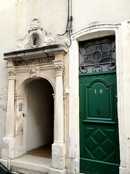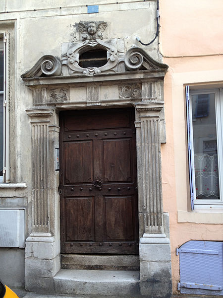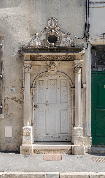 La porte d'entrée avec ses deux pilastres, l'entablement à triglyphes et le fronton la surmontant : inscription par arrêté du 31 octobre 1941