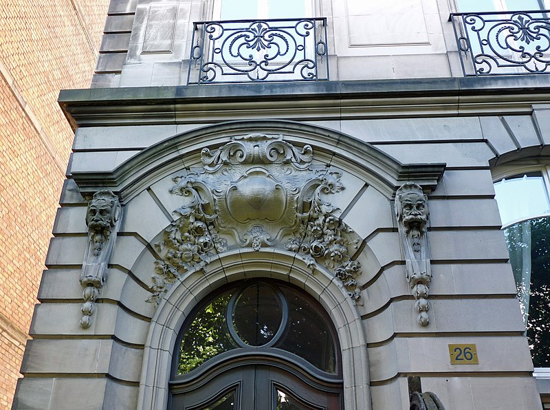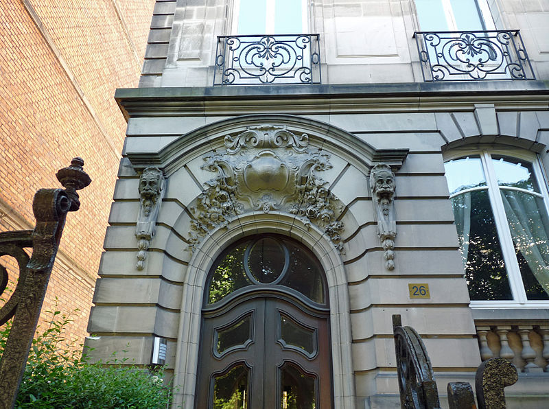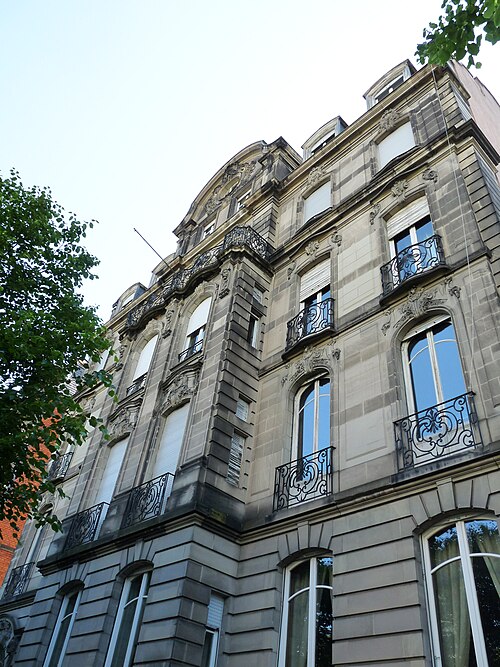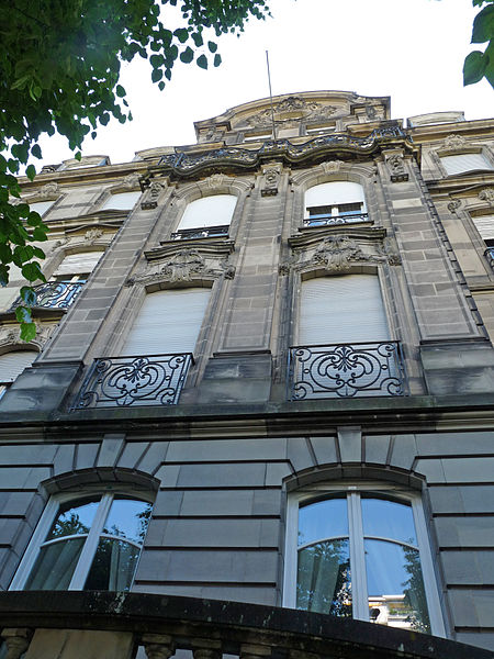 Immeuble. Commandé en 1905 aux architectes Frantz Lütke et Heinrich Backes, l'édifice a finalement été réalisé en 1909 par Emil Widmann. Le projet, qui n'affiche plus les tendances Jugendstil de ses commanditaires, adopte un langage historicisant évoquant le baroque allemand et le classicisme français. Un ascenseur panoramique en verre, bois et métal, équipé d'un moteur électrique et daté de 1910, constitue un élément remarquable du bâtiment. Les façades, les toitures, le vestibule, la cage d'escalier et l'ascenseur sont inscrits au titre des monuments historiques depuis 2009, faisant de cet immeuble un témoignage singulier de l'architecture d'époque impériale à Strasbourg.
