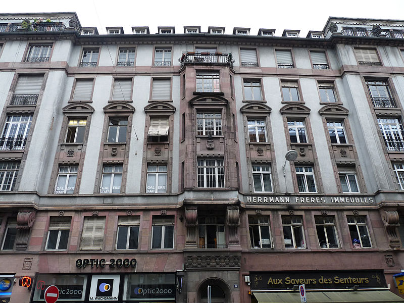 L'immeuble situé au 16, rue du 22‑Novembre à Strasbourg a été réalisé en 1912 d'après les plans des architectes Backes et Zache. Il s'inscrit dans un style éclectique et présente un ordre géant ainsi que des frontons demi‑circulaires. L'édifice comprend un rez‑de‑chaussée rythmé par des espaces commerciaux et, au‑dessus, un ensemble de vastes logements répartis sur six étages. Une cage d'escalier tournante dessert chacun de ces étages ; elle est éclairée par trois fenêtres ornées de vitraux polychromes au décor à la fois géométrique et figuratif. L'immeuble fait l'objet d'une inscription au titre des monuments historiques depuis 2009.