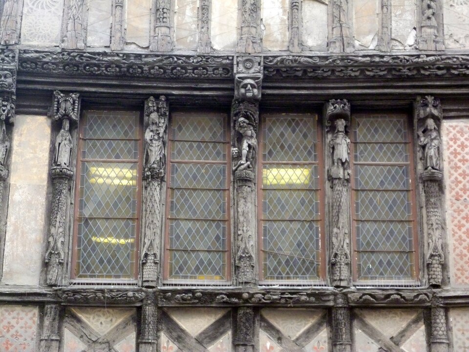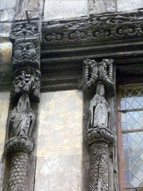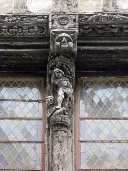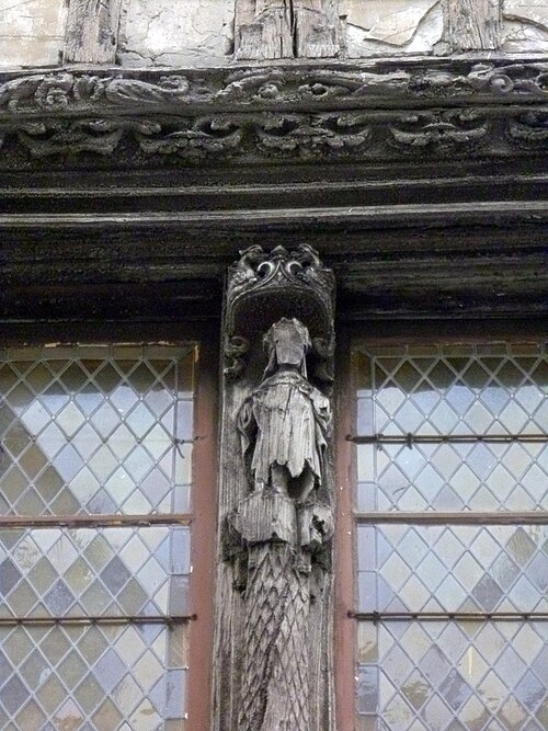 La façade est à pans de bois, torchis et brique, tandis que le reste de l'édifice est en pierre de Caen. Contrairement au n°52, les hourdis du n°54 sont traités en polychromie : les espaces entre les pièces de bois sont remplis par des plaques de plâtre estampées formant des creux d'environ un centimètre, remplis d'un mastic coloré en rouge, noir, jaune, brun et bleu ; ce décor polychrome a été restauré en 2017-2018. La façade présente un riche décor sculpté en bois mêlant motifs religieux et éléments annonçant la Renaissance : les sablières portent des frises de végétaux et d'animaux, et les poteaux et potelets des premier et deuxième étages sont ornés de pinacles surmontés de statuettes en ronde-bosse. Au centre du premier étage figure saint Michel terrassant le dragon ; de part et d'autre se voient saint Pierre tenant les clés, saint Joseph, Jésus et la Vierge à l'Enfant, surmontés par un homme et une femme en prière qui pourraient représenter les propriétaires. Lors de la restauration des années 2010, ces éléments sculptés ont été repeints en rouge, comme à l'origine.