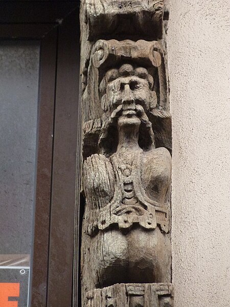 Le rez-de-chaussée est occupé par des boutiques ; deux étages forment des encorbellements successifs.
