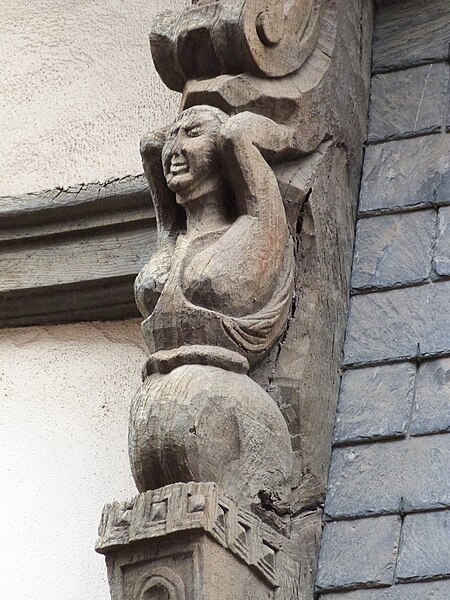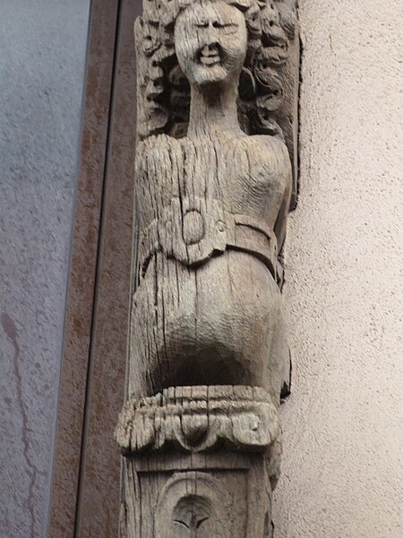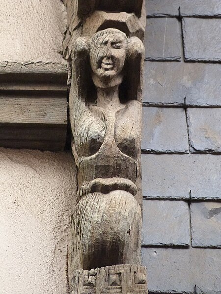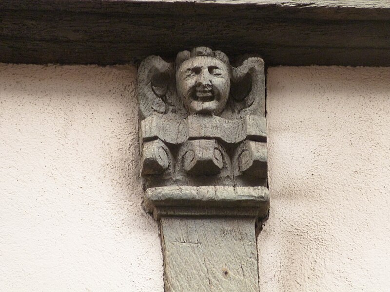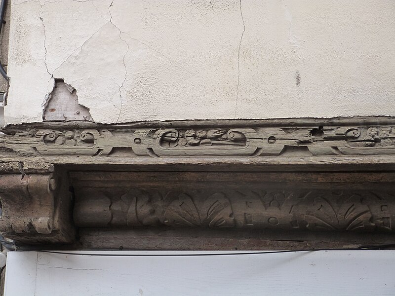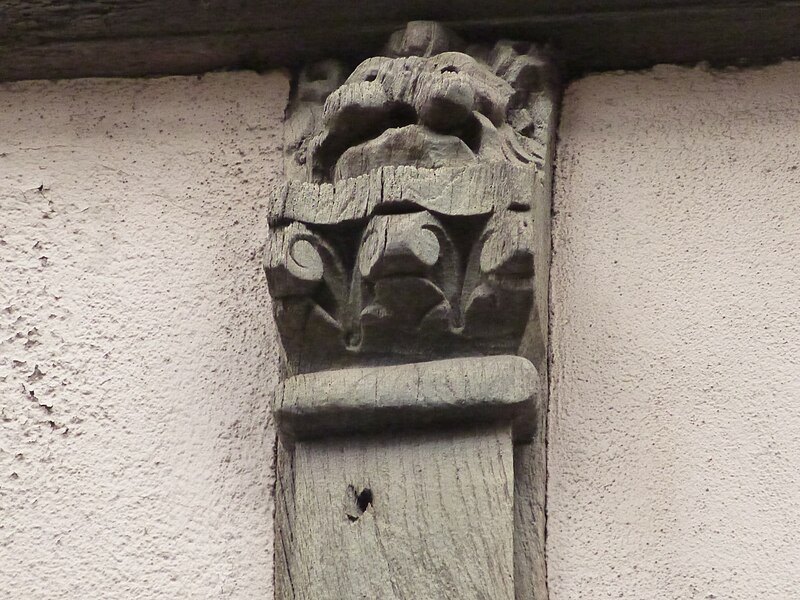 La façade, datée du XVIIe siècle, présente des montants et des sablières sculptés ornés de cartouches et d'entrelacs.