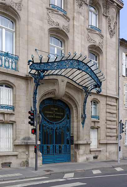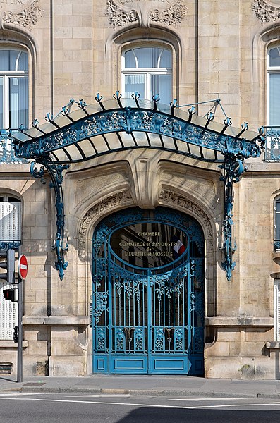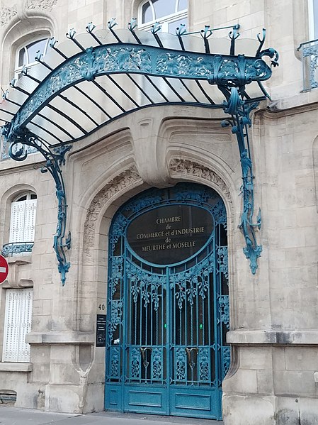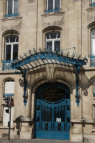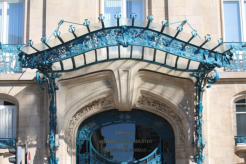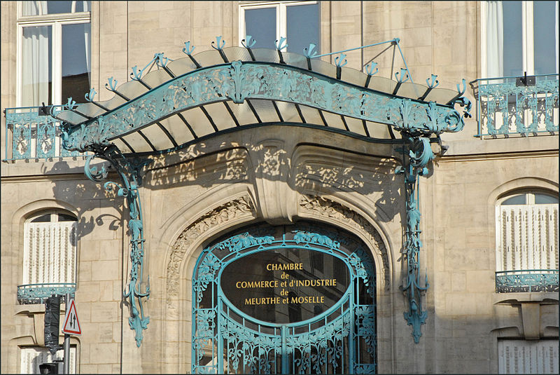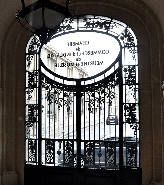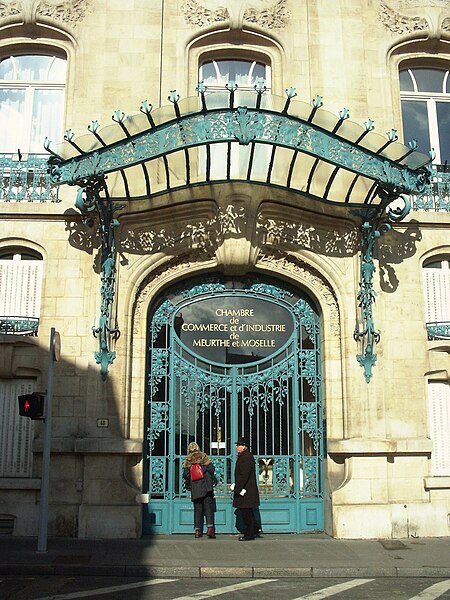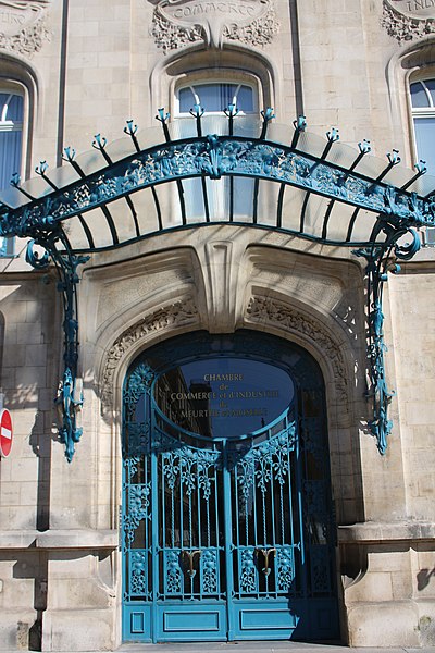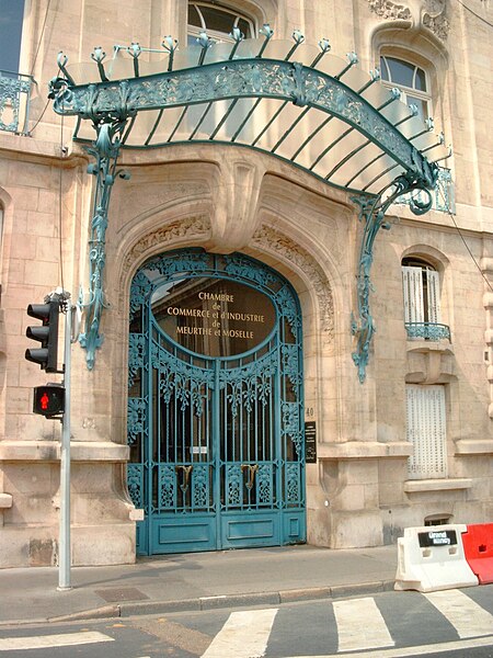 L'immeuble qui abrite le siège de la Chambre de commerce et d'industrie de Meurthe-et-Moselle à Nancy a été construit entre 1906 et 1908 pour la Chambre de commerce et la Société industrielle de l'Est, puis inauguré en juin 1909. Le projet néo‑classique des architectes Émile Toussaint et Louis Marchal, choisi à l'issue d'un concours ouvert aux architectes de l'Est, succéda à une première étude confiée en 1903 à l'ingénieur Henri Gutton, après la proposition d'Antonin Daum de lancer ce concours. Les plans d'exécution datent du 1er juin 1905 ; l'entreprise Malesset Couty assura le gros‑œuvre et Frédéric Schertzer la charpente métallique, réalisée avec de l'acier fourni par une usine de Pompey. Louis Majorelle fournit les ferronneries tandis que Jacques Gruber exécuta les verrières et la décoration sculptée de la façade, l'ensemble sculpté et verrier ayant été réalisé en 1909. Le décor intérieur associe de nombreux artisans nancéiens : Louis Burtin et Pierre Claudin pour les stucs, Louis Guingot pour une peinture de la salle de la Société industrielle de l'Est au rez‑de‑chaussée, et le menuisier Petit pour les lambris. Les lambris de la salle de réunion du premier étage comportent des pâtes de verre réalisées par Amalric Walter de la maison Daum. Entre 1912 et 1913, les architectes ajoutèrent un étage de comble au corps principal donnant sur la rue, entraînant la disparition de la terrasse couverte en ciment. En 1955 la grande verrière du hall de la bourse fut déposée, et en 1979 le mobilier de la salle de réunion de la Société industrielle de l'Est au rez‑de‑chaussée fut en partie démonté puis remonté au musée de l'École de Nancy. Représentatif de l'Art nouveau et de l'École de Nancy, l'édifice réunit architecture, ferronnerie, verrerie et arts décoratifs réalisés par des acteurs majeurs du mouvement. Une partie importante du bâtiment bénéficie d'une protection au titre des monuments historiques : la façade et la toiture sur rue, la marquise de Majorelle, le vestibule, la cage d'escalier, la salle dite de la bourse avec ses verrières de Gruber ainsi que la salle dite du conseil et ses décors ont été inscrites le 4 mai 1994. Les verrières de Jacques Gruber ont été classées le 5 juillet 1996 et un arrêté du 28 février 2013 a étendu la protection à l'ensemble des façades et toitures de plusieurs bâtiments, au couloir du rez‑de‑chaussée, à l'intérieur de la salle des vitraux, à la salle Jean‑Lamour et au bureau du président du bâtiment B.