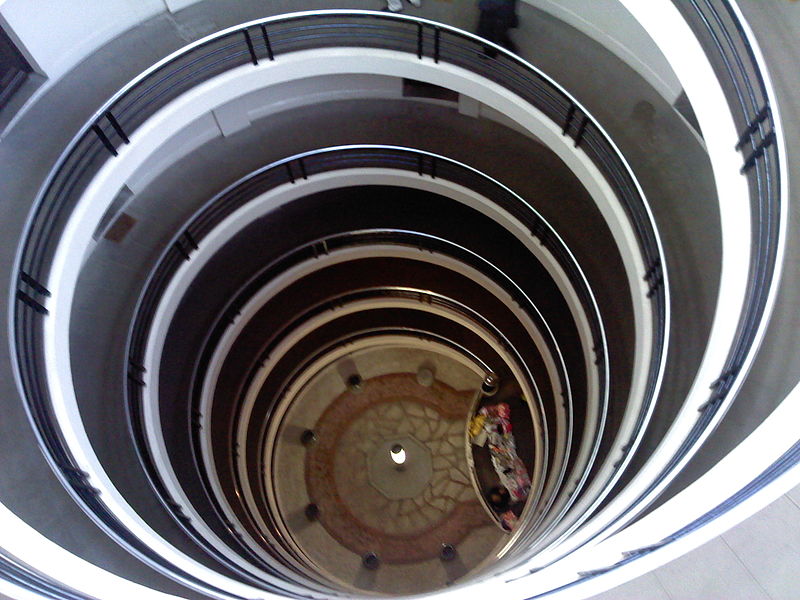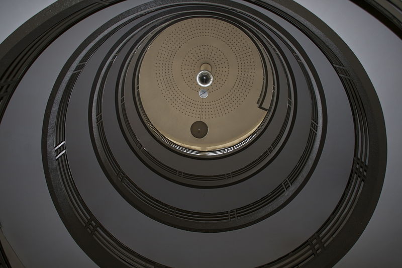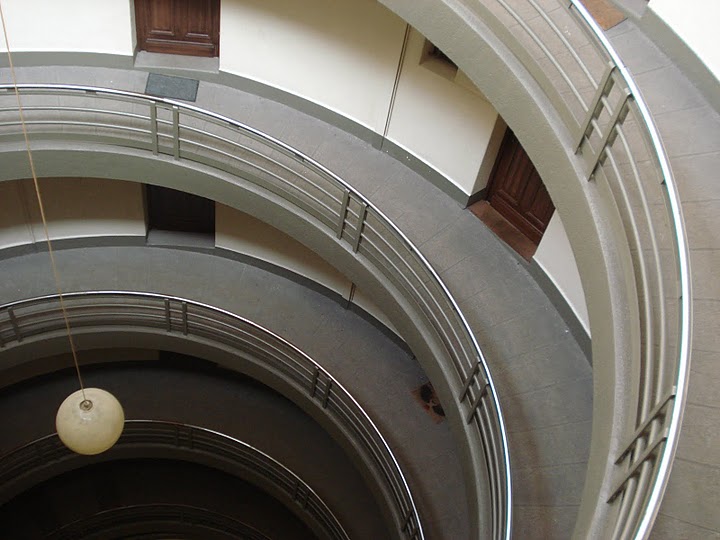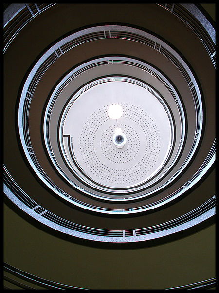 Façades et terrasses ; espace intérieur avec cour, rampe d'accès hélicoïdale, façades et verrières (cad. LN 87) : inscription par arrêté du 21 février 1989
