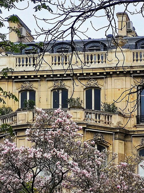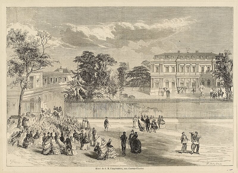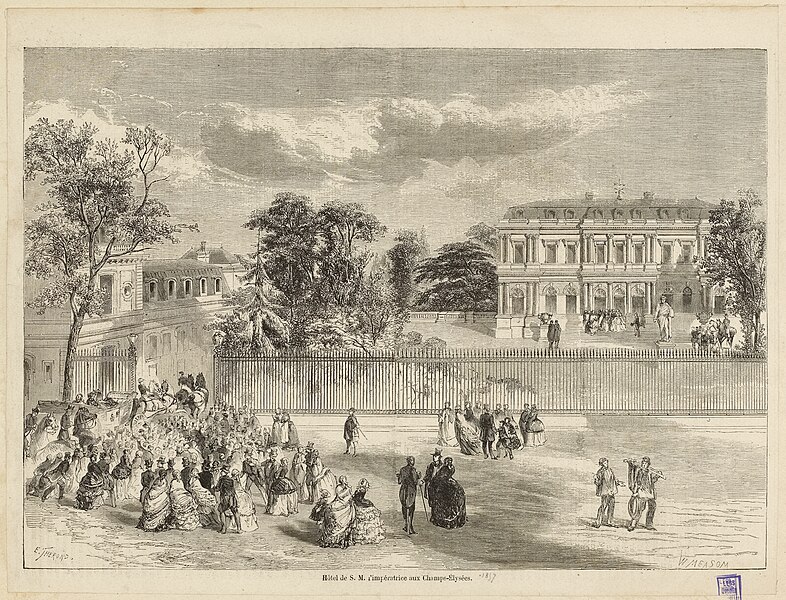 En 1861 Émile Pereire mit en vente un vaste terrain contigu au palais de l'Élysée, bordé par la rue alors nommée rue de la Reine‑Hortense, où le règlement d'urbanisme interdisait les usages commerciaux ou professionnels. Le long de la rue furent érigés de petits hôtels particuliers d'un style homogène, inspirés des maisons géorgiennes londoniennes avec perrons, cinq marches et cours anglaises. L'impératrice acquit une parcelle à l'angle de l'avenue Gabriel et fit édifier au no 2 de la rue de l'Élysée un hôtel de trois étages dont les fenêtres donnaient sur la rue et sur un jardin s'étendant jusqu'à l'avenue. Elle y logea des amis de passage, y chercha de l'intimité et y hébergea éventuellement sa mère ; l'hôtel fut prêté à la princesse Anna Murat puis loué à un particulier.