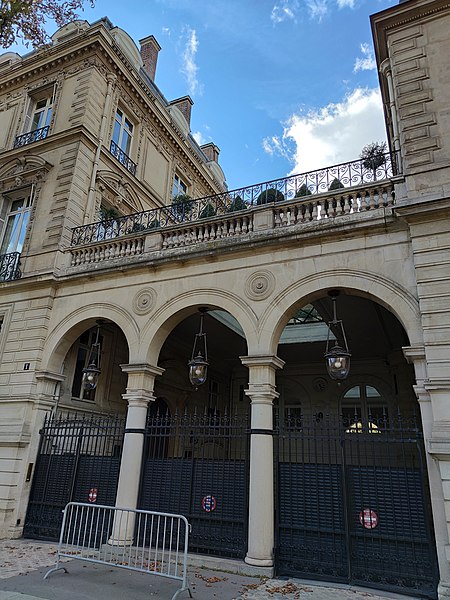 Une galerie reliait ce corps de bâtiment au deuxième logis sur l'avenue Gabriel ; elle était meublée de commodes de marqueterie de Boulle et conduisait à une salle des fêtes de style Louis XIV, capable d'accueillir deux mille convives et éclairée par des lustres en cristal de Bohême. Une véranda s'étendait sur le jardin depuis cette galerie. Le second corps abritait un escalier d'honneur conçu par Émile Peyre, réalisé en marbre blanc veiné de vert avec une large première volée en ligne droite et des volées latérales conduisant aux salons du premier étage ; la cage d'escalier était richement ornée de motifs, de peintures signées Chevallier, de tableaux anciens et de sculptures décoratives. La réalisation de cet escalier coûta plusieurs millions de francs et suscita des commentaires contrastés : Édouard Drumont le jugeait disproportionné tandis que Theodor Herzl le trouva grandiose et impressionnant.