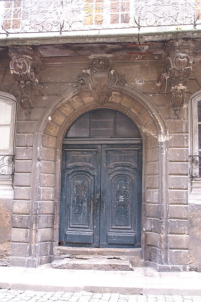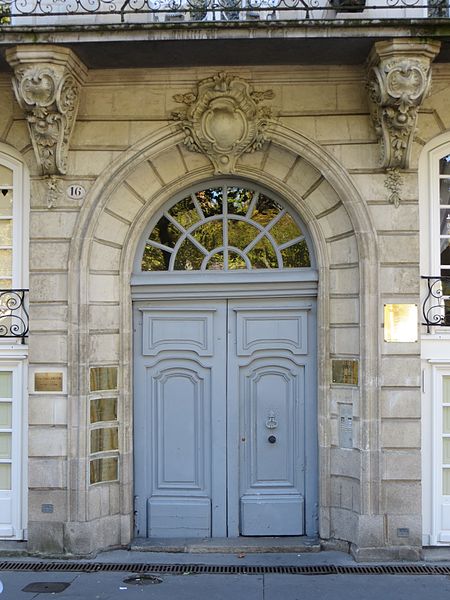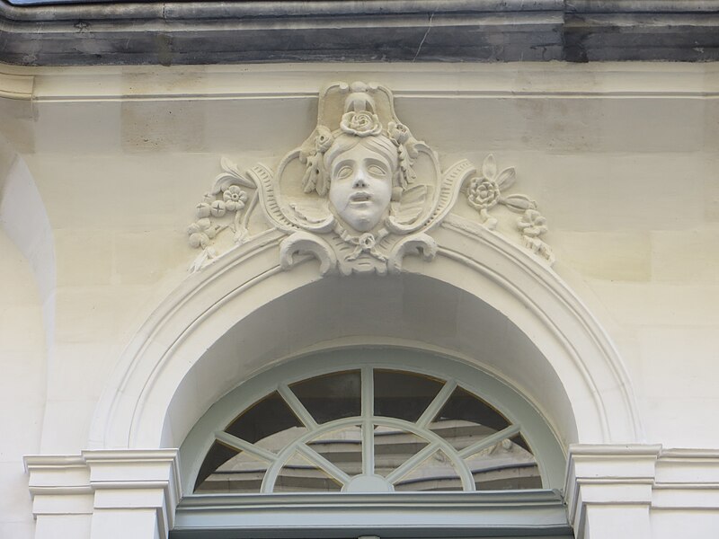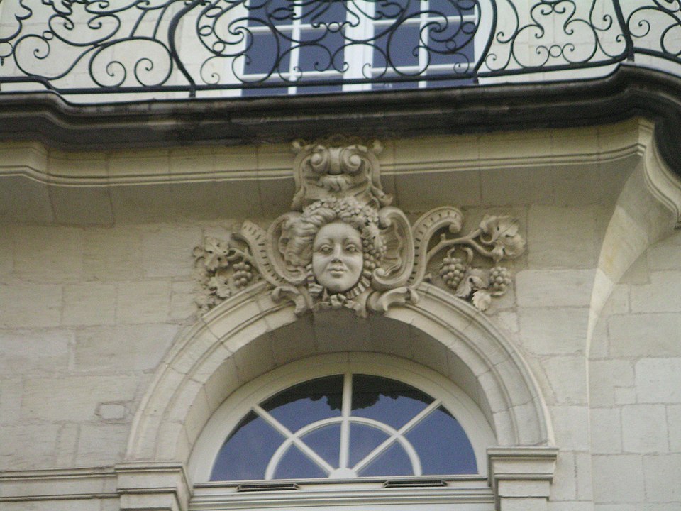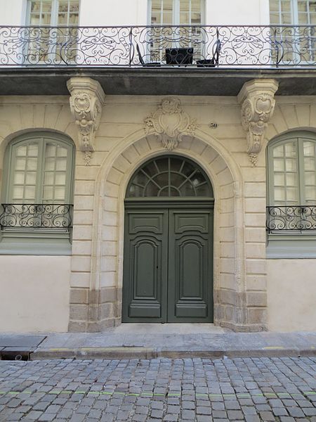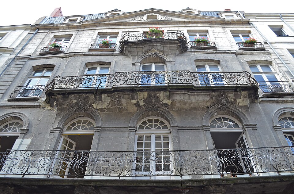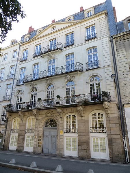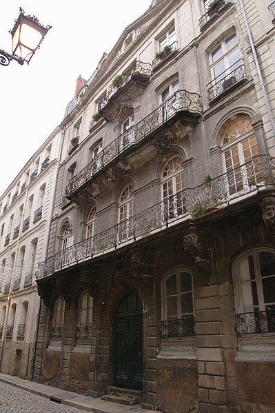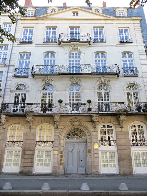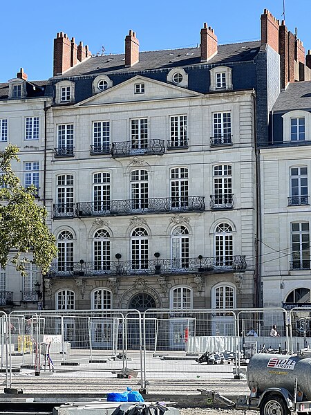 Le balcon du premier étage, soutenu par six consoles ventrues monumentales, couvre toute la largeur et protège cinq portes-fenêtres en plein cintre ; au second étage le balcon se réduit aux trois portes-fenêtres centrales et repose sur des trompes, et au troisième il ne protège que la porte-fenêtre centrale, les autres ouvertures étant des fenêtres rectangulaires à banquette. L'ensemble est surmonté d'un fronton triangulaire ajouré, de deux lucarnes rondes et de chiens-assis. Trois mascarons ornent le premier étage de chaque façade, dont deux aux traits humains flanquant la baie centrale ; l'un côté quai représente une femme coiffée de guirlandes et de grappes de raisin, l'autre un homme barbu et enturbanné aux allures de voyageur ou d'Indien, des motifs pouvant évoquer les origines maritimes et commerciales de Nantes et, plus particulièrement, le commerce triangulaire.