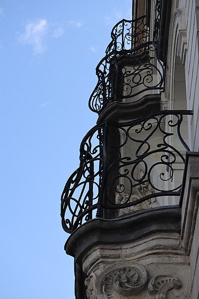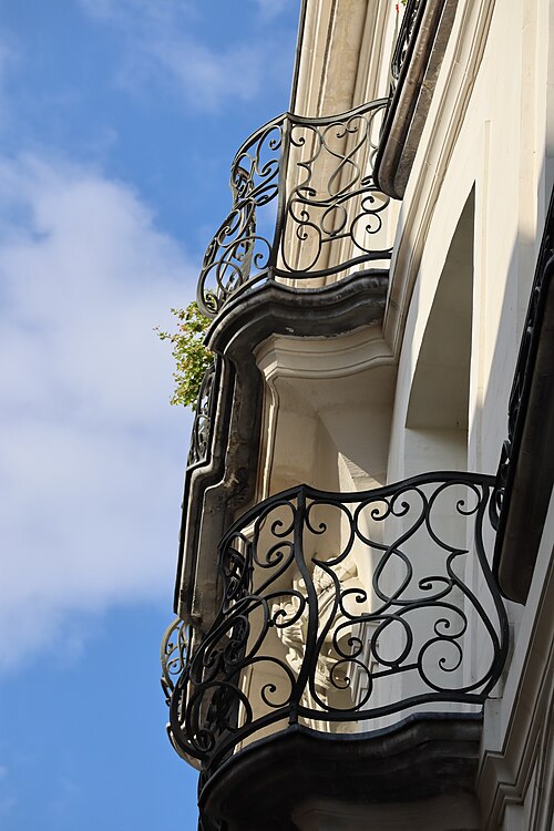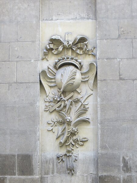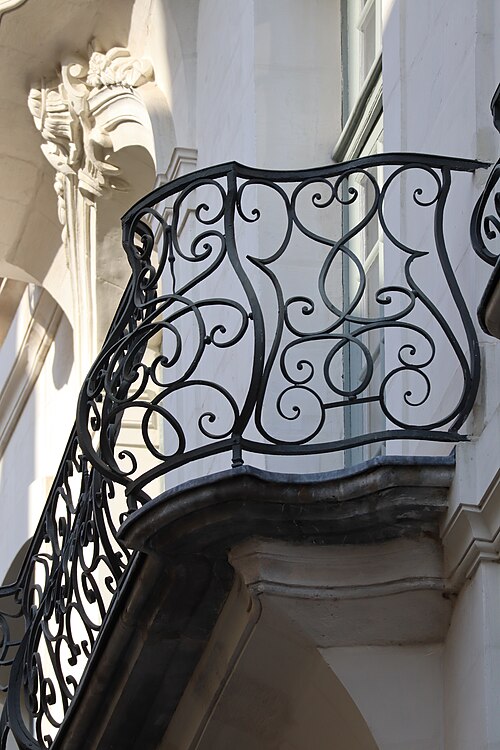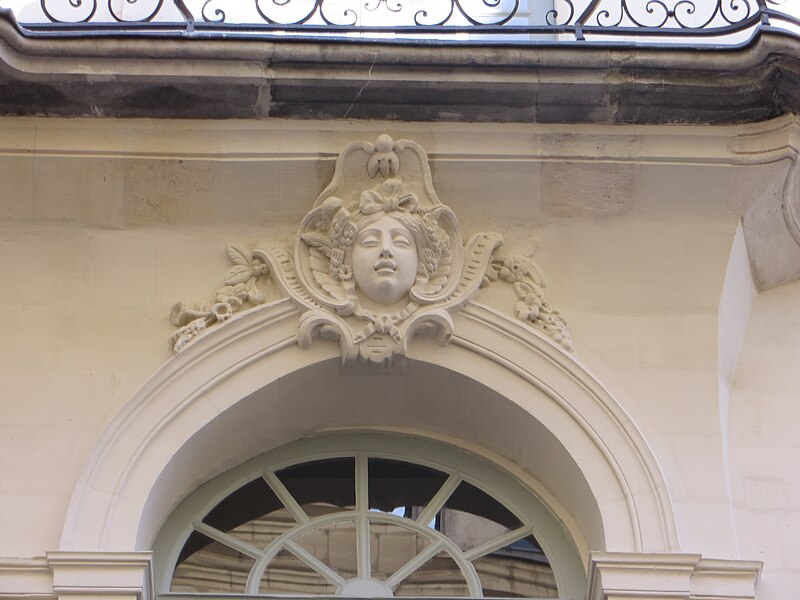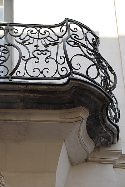 Pierre Rousseau affirme sa personnalité sur les façades côté quai et côté rue, presque identiques, par la richesse des sculptures et des balcons. Le style combine un baroque tempéré, avec des motifs naturalistes, une certaine asymétrie et des courbes mesurées, et des accents classiques qui structurent l'ensemble. Les lignes verticales des cinq travées organisent la composition autour de la travée centrale, prolongée jusqu'au fronton, tandis que les balcons dessinent une pyramide ascendante renforcée par des agrafes guidant le regard vers le haut. La pyramide formée par les trois niveaux de balcons, dont les sols sont en marbre noir de Sablé, accentue l'élévation et le prestige de la façade.