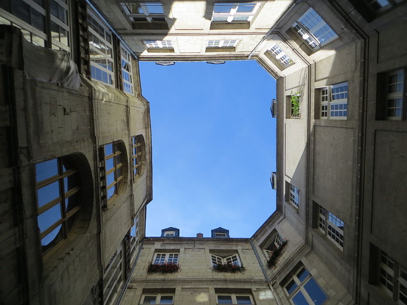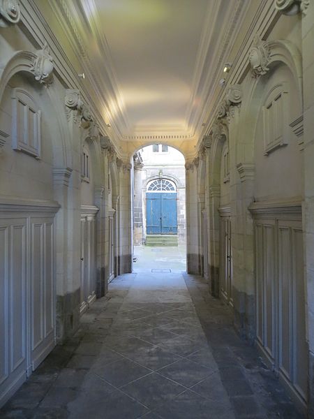 L'entrée côté quai comprenait une porte cochère ouvrant sur un couloir bordé de boutiques et d'entrepôts menant à la cour intérieure, où les calèches pouvaient faire demi-tour sous le porche de l'escalier ; ce passage combine des traits baroques, comme des plafonds aux angles arrondis, et classiques, tels les arcades et les pilastres à chapiteaux ioniques. La cour centrale, axée sur le couloir traversant, est décorée d'agrafes et de motifs sculptés, dont un rappelant la profession d'architecte de Pierre Rousseau. L'escalier, élément majeur de la cour, est mis en valeur par un portique en arc à trois courbes orné d'une agrafe et encadré de deux colonnes doriques qui supportent un entablement à triglyphes et métopes prolongé par des balustrades en marbre rose ; l'escalier de granit voûté en hélice et la rampe à ferronneries dissymétriques renforcent l'effet de monumentalité et de lumière.
