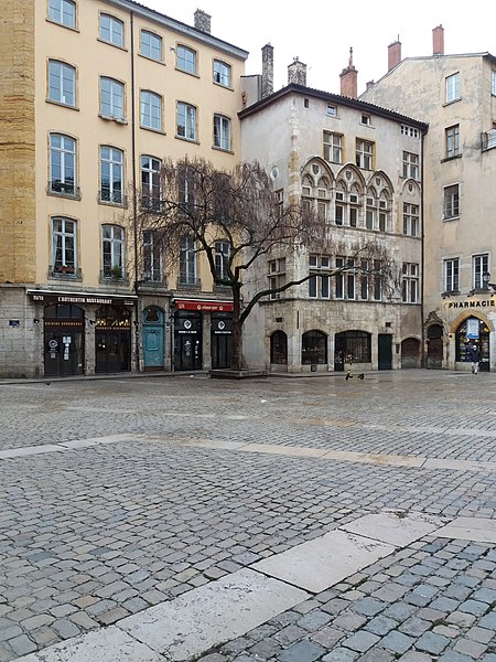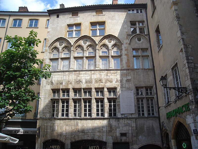 La Maison Thomassin, située au 2 de la place du Change dans le Vieux Lyon (5e arrondissement), est l’une des plus anciennes et remarquables demeures du quartier, remarquable par sa façade gothique ornée et son rôle dans la vie économique et sociale médiévale de la ville. Édifiée en 1298 par la famille de Fuers, elle ne conserve aujourd’hui qu’un plafond peint au premier étage, découvert en 1968, orné des armoiries des Fuers, de saint Louis et de Blanche de Castille ; ce décor est considéré comme l’un des plus anciens plafonds peints de France. À la fin du XIVe siècle, la maison passe aux mains de la famille Thomassin, marchands de drap, et Claude Thomassin procède en 1493 à une reconstruction qui dote la façade d’un style gothique flamboyant. Son petit‑fils René Thomassin devient en 1595 le premier prévôt des marchands de Lyon, charge instituée par un édit d’Henri IV. La maison figure à l’Inventaire des Monuments Historiques depuis 1927 et a été classée Monument historique en 1992 ; sont protégés la galerie sur cour, l’escalier à vis avec sa tourelle, les façades et toitures ainsi que le plafond peint dit du rez‑de‑chaussée surélevé. Aujourd’hui le bâtiment accueille un concept store de décoration et de cadeaux, qui permet de visiter ce lieu chargé d’histoire tout en découvrant des produits contemporains. La façade présente des fenêtres à meneaux surmontées d’une frise de signes du zodiaque, aujourd’hui très abîmée. Au second étage, les baies jumelées sont ornées d’arcs trilobés et encadrées par un large arc ogival qui abrite les blasons du dauphin, du roi Charles VIII et de la reine Anne de Bretagne ; un quatrième blason, ajouté au XIXe siècle, résulte d’une extension réalisée sur l’ancienne « ruette des Bestes », une ruelle conduisant à la Saône. Voir aussi la liste des monuments historiques de Lyon, la place du Change et les portails consacrés à la métropole de Lyon, à l’architecture et à l’urbanisme, ainsi qu’aux monuments historiques français.