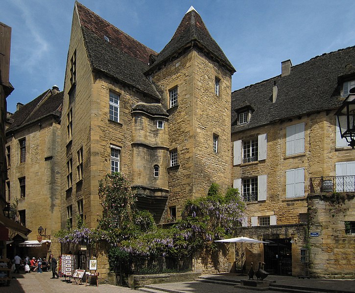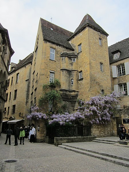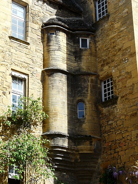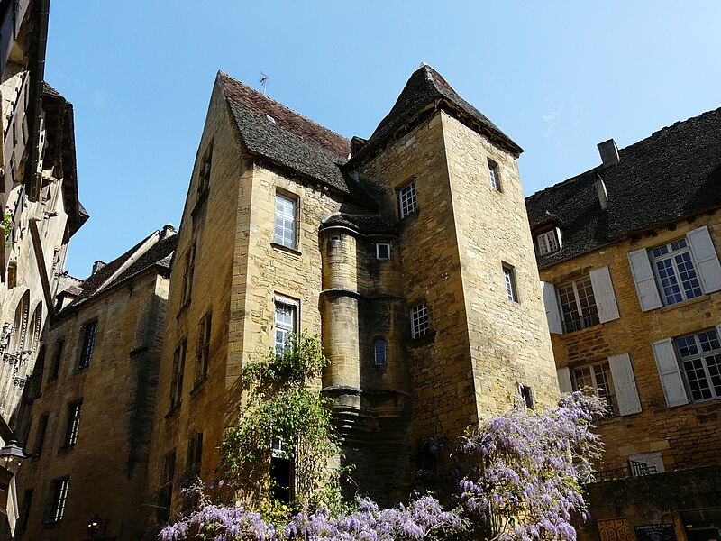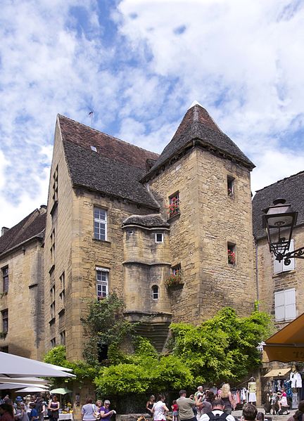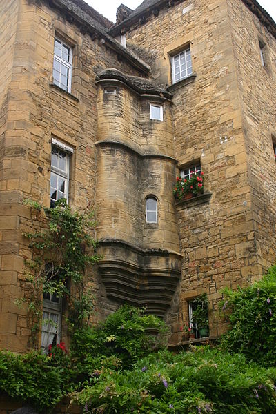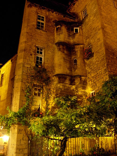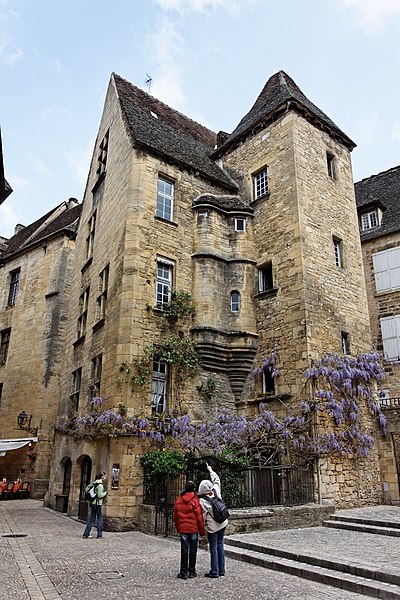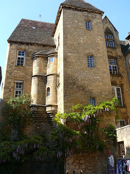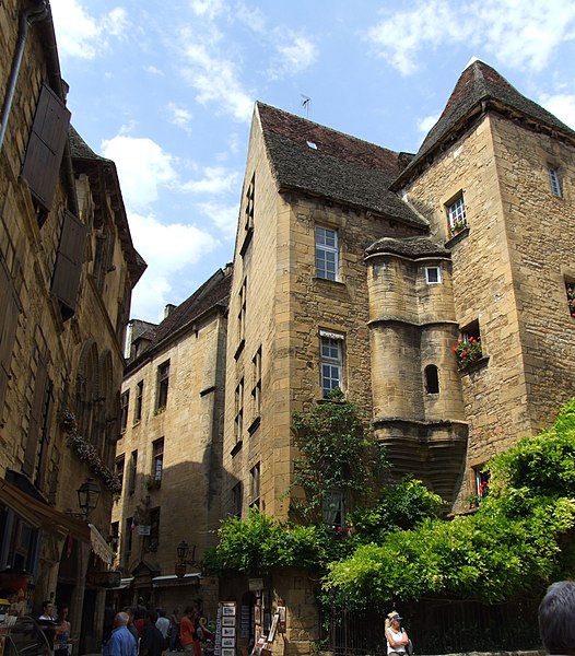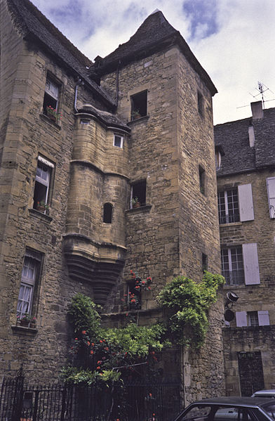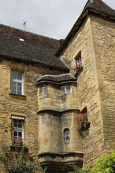 Immeuble, témoin de Sarlat au XVe siècle, doté d'une tourelle carrée et d'une tourelle en encorbellement.