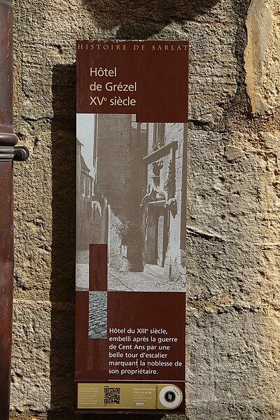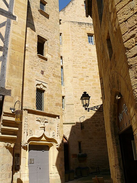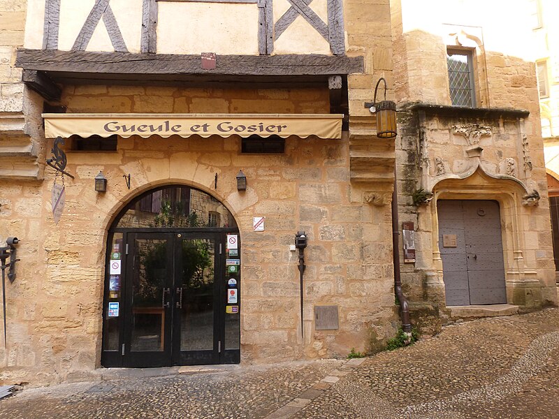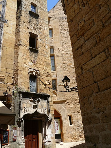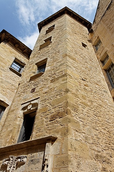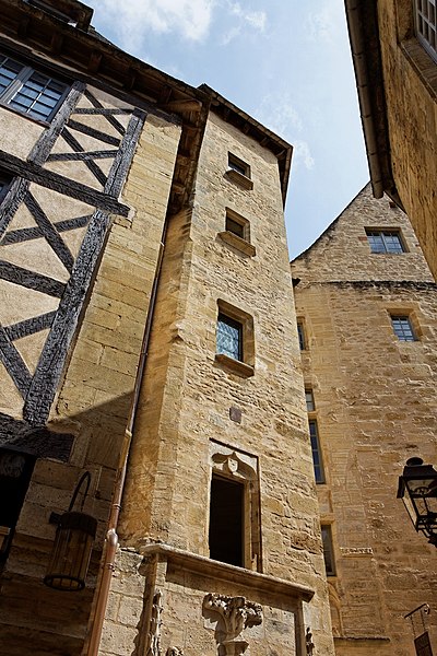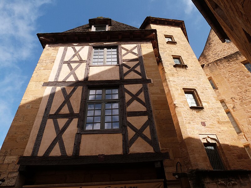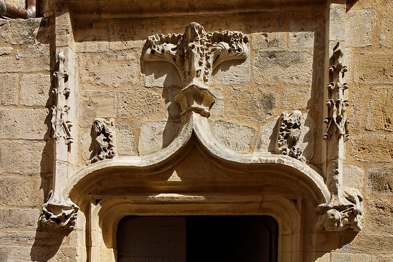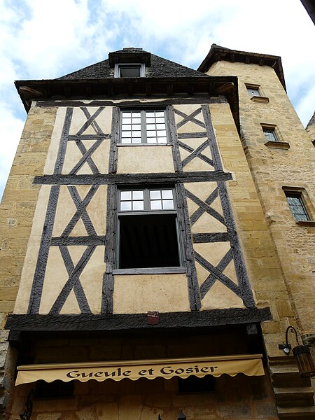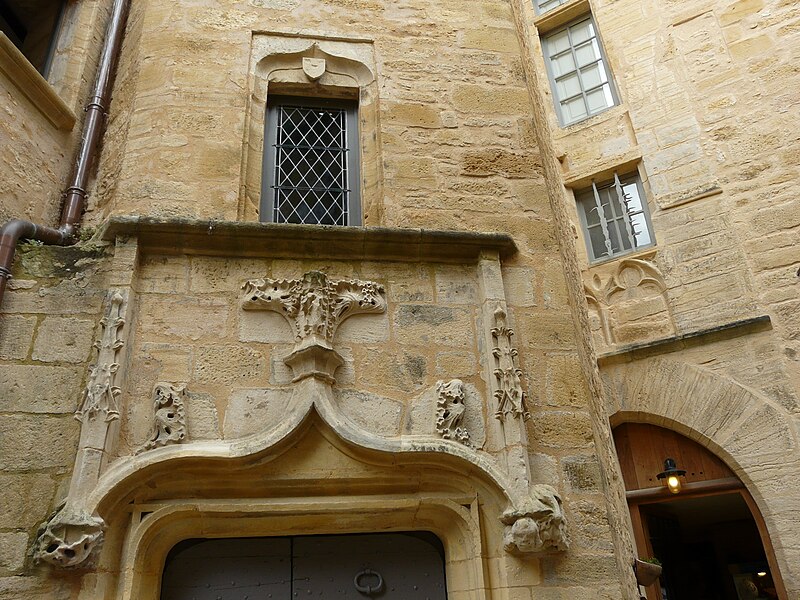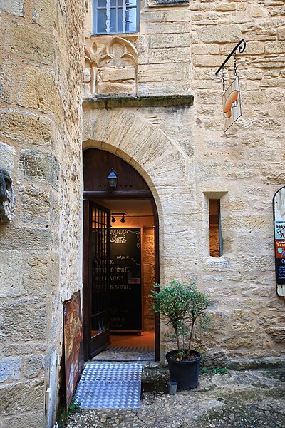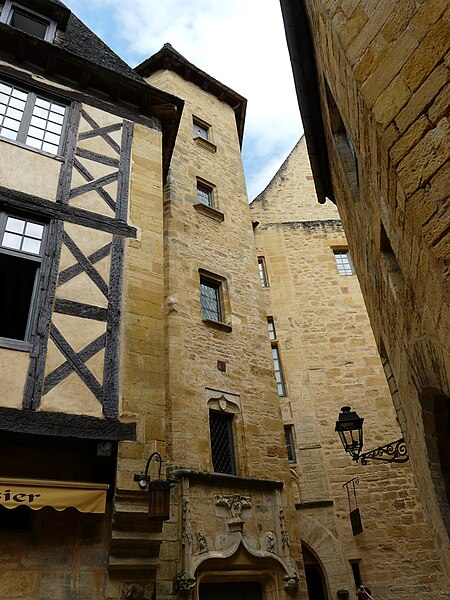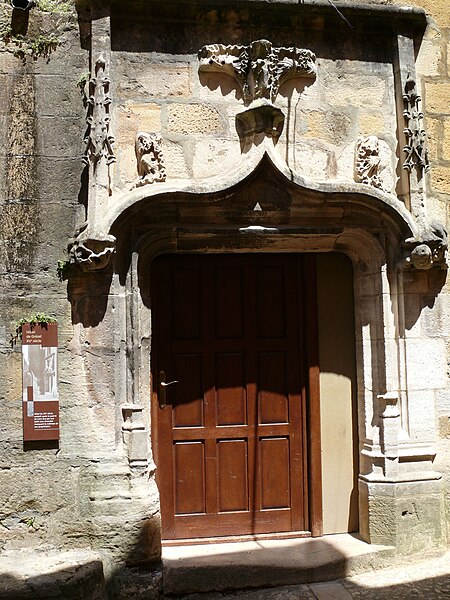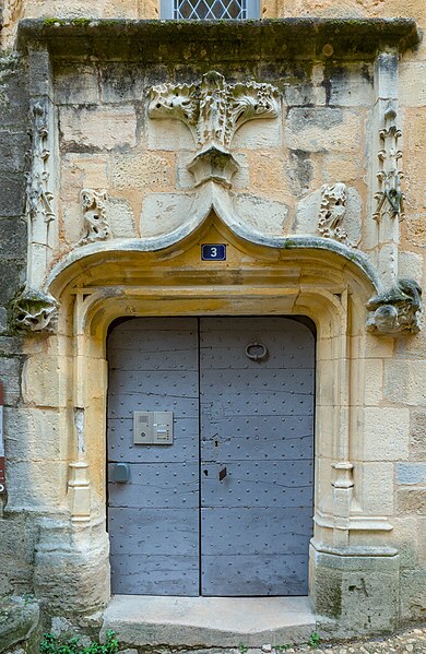 La façade à pans de bois en encorbellement repose sur des corbeaux en pierre de taille moulurée et illustre les caractéristiques de construction du XVIe siècle dans la région. Une porte ornée de fleurons et de pinacles ouvre sur l'escalier à vis logé dans une tourelle octogonale en pierre de taille.