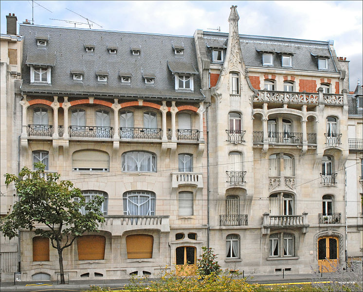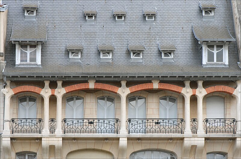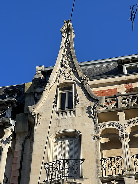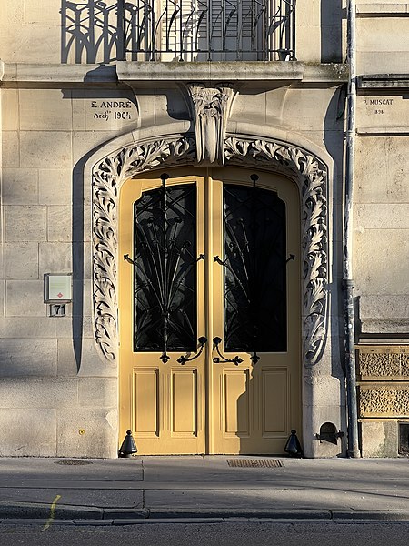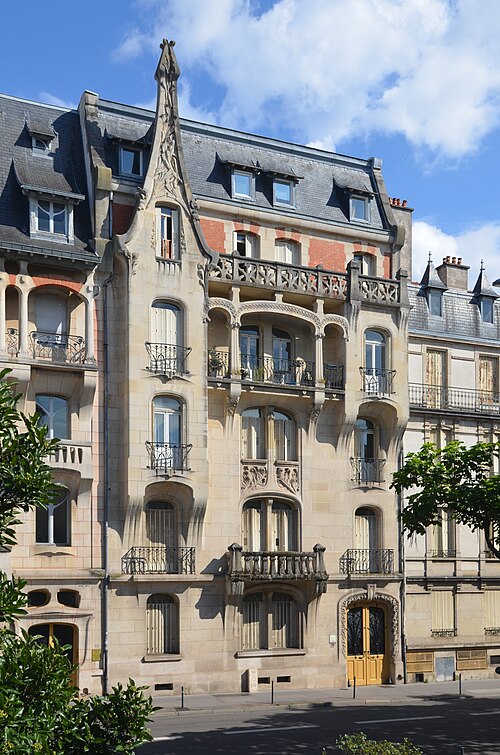 Immeuble construit entre 1902 et 1904 par l'architecte Émile André (1871-1933) pour l'entrepreneur nancéien Jean‑Baptiste Lanord, dit France Lanord, associé depuis 1900 à son neveu Auguste Bichaton au sein de l'entreprise France Lanord et Bichaton. Émile André a réalisé une série de huit projets, dont un daté de février 1903 ; sa date et sa signature figurent de part et d'autre de la fenêtre axiale du rez-de‑chaussée, et il est également l'auteur des ferronneries. Le plancher en béton armé a été exécuté par l'entreprise France Lanord et Bichaton, concessionnaire du système Hennebique, qui a assuré le gros‑œuvre ; ces attributions sont établies par des travaux historiques. L'entrepreneur France Lanord fut l'un des premiers en France à utiliser le béton armé. La façade est rythmée par deux avant‑corps latéraux et une coursière qui, contrairement à celle de l'édifice voisin, porte un balcon. La décoration végétale, abondante et variée, reprend des motifs d'algues, de fougères, de chardons et de fleurs stylisées. La partie haute de la maison révèle des influences de l'architecture strasbourgeoise et flamande. La remise d'automobile a été détruite.