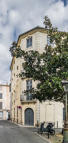 Le quartier était autrefois occupé par des teinturiers qui utilisaient les eaux du canal de l'Agau. En 1770, la rue fit l'objet d'un plan d'élargissement. Le propriétaire de la maison est connu à partir de 1671. Le balcon du premier étage comprend une partie droite encadrée par deux retours arrondis ; la partie droite porte un grand panneau central surmonté d'un médaillon circulaire axial au monogramme CA et de la date 1771. Le remplage présente des C et des volutes à rebroussement, tandis que de petits pilastres latéraux affichent le dessin d'une urne, agrémenté d'un motif de feuillages bourgeonnant prolongé par une tige ondulée. Les panneaux courbes latéraux sont composés de volutes en C infléchies, sans symétrie. Les mêmes dispositions se répètent intégralement au balcon du deuxième étage. Les dallages des balcons sont chacun supportés par trois consoles en fer forgé.