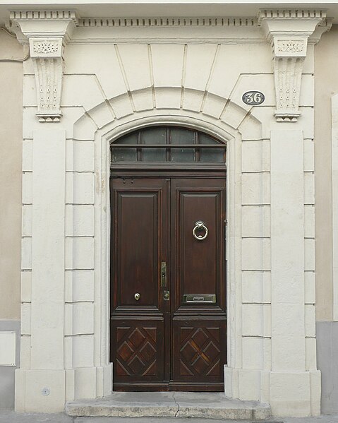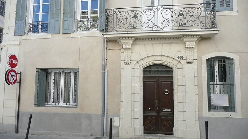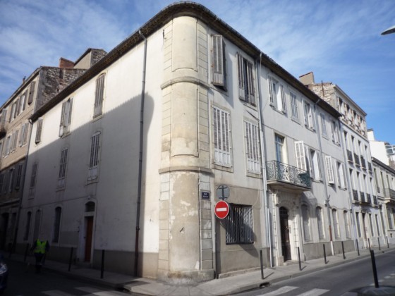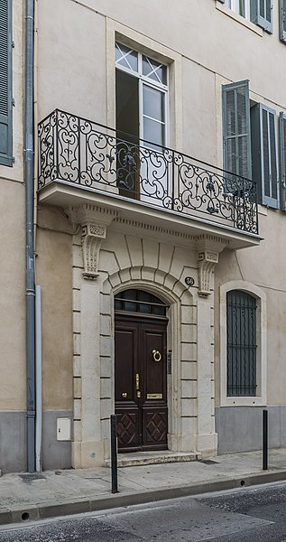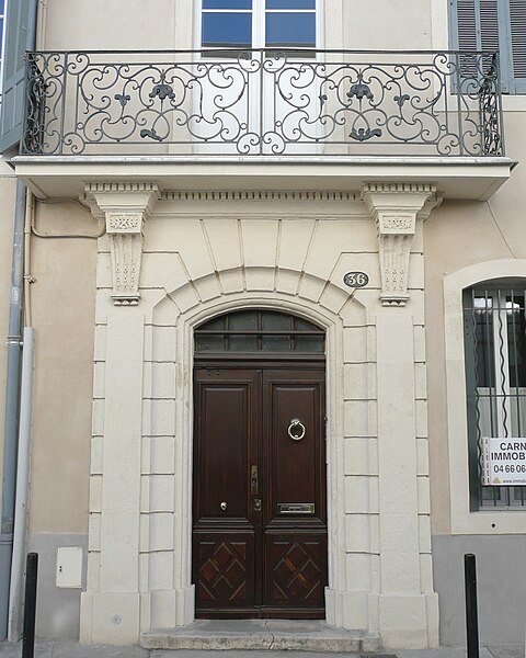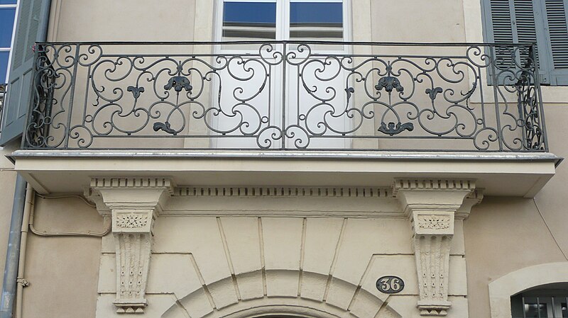 Le lotissement de l'enclos Roussy, commencé en 1776, a donné naissance aux rues Roussy, Monjardin et autres voies adjacentes. Les conditions imposées aux propriétaires des immeubles d'angle exigeaient que l'angle soit traité en tour ronde et que le nom des rues soit inscrit en lettres capitales. L'immeuble se compose d'une maison d'angle, d'une maison adjacente et d'une maison plus importante bordant la rue Monjardin. L'angle en tour ronde présente de grands tableaux à crossettes et un encadrement de chaînes à refends. La maison adjacente s'ouvre au rez-de-chaussée par une porte sous un arc en segment de cercle dont la voussure, profonde, est décorée de refends. Les pilastres d'encadrement portent des consoles cannelées ornées de feuillage; ces consoles, reposant sur une assise moulurée, soutiennent la dalle du grand balcon droit. La ferronnerie comporte deux grands panneaux jointifs à double encadrement, encadrés de pilastres latéraux et accompagnés de panneaux de retour. Chaque grand panneau est orné au centre d'un fleuron en tôle, souligné par un fer bouclé décoré d'un autre fleuron; le décor se complète par un remplage de volutes en C ramifiées et de fines volutes en S chargées de feuillages de tôle. Les balustres latéraux présentent un dessin symétrique de volutes rebroussées marquant la panse de l'urne, tandis que les panneaux de retour sont composés de courtes volutes dans un double encadrement.