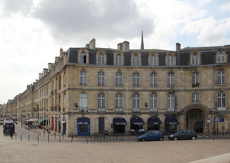 L'idée d'une place royale et d'une façade uniforme le long de la Garonne a mis longtemps à s'imposer. En 1729, Jacques Gabriel a présenté trois projets ; en 1731 il a construit le quai de la Douane et les façades en bordure. En 1746, l'intendant Claude Boucher a obtenu des jurats l'acceptation de la première création d'un quai. À la mort de Boucher, Aubert de Tourny a repris le projet avec Ange-Jacques Gabriel. La perspective monumentale, réalisée sur l'initiative de Tourny, a été construite en 1748. Il s'agit d'une ordonnance architecturale homogène qui prolonge la place de la Bourse, ancienne place Royale, face au fleuve. Le dispositif comprend un rez-de-chaussée et un entresol formant soubassement, inscrits dans une série d'arcades en plein cintre, puis deux grands étages carrés surmontés d'un comble à la Mansard percé de lucarnes en pierre. Le motif de soubassement est souligné par des refends et de riches sculptures à la clé des arcades. Si certaines façades ont perdu leurs appuis ou leurs balcons en fer forgé, elles ont conservé leur caractère grâce aux encadrements et aux larmiers d'origine. Des magasins se sont installés au rez-de-chaussée, portant parfois atteinte aux arcades.
