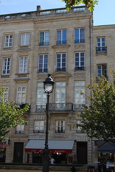 Immeuble du XVIIIe siècle. Au rez-de-chaussée, la boutique présente trois ouvertures carrées ; l'appareil en saillie se poursuit à l'entresol où les baies sont arrondies. Un balcon porté par des consoles sculptées, terminées par des têtes de lion, s'ouvre sur trois hautes portes-fenêtres à encadrement mouluré, surmontées de bandeaux sculptés. Entre deux consoles soutenant la corniche figurent des têtes et des rinceaux, décor repris au deuxième étage. Une corniche moulurée, elle aussi portée par des consoles, supporte la balustrade de pierre qui couronne l'édifice.