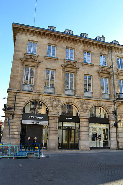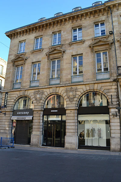 La façade en pierre de taille est traitée en maçonnerie à bossage et percée de trois grandes arcades qui comprennent les baies de l'entresol et du rez-de-chaussée. Le premier étage est souligné par un grand balcon porté sur une console, et la façade est couronnée d'une corniche elle aussi appuyée sur des consoles. Au rez-de-chaussée, les piles sont décorées de médaillons sculptés en bas-relief.